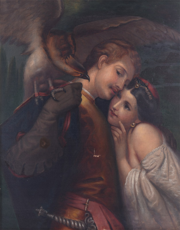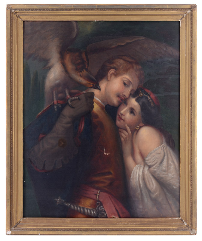 19TH CENTURY ROMANTIC GENRE PAINTING FALCONER AND BEAUTY: Oil/Canvas, 27 1/4'' x 22 1/4'', no visible signature, encased in the original gilded liner, 30 1/2'' x 25 3/4''.