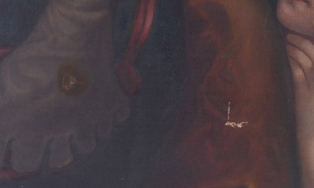 CONDITION: Needs cleaning, puncture in the lower mid section, mild scattered craquelure, liner has loss of gesso, sold as is.