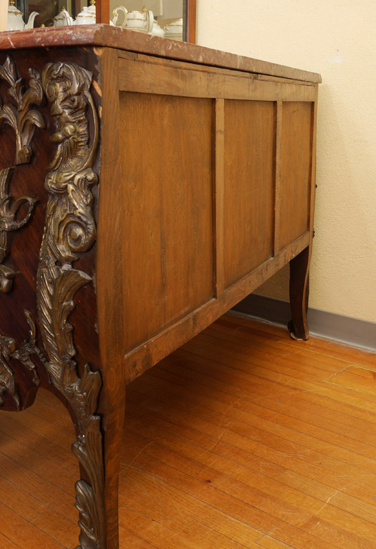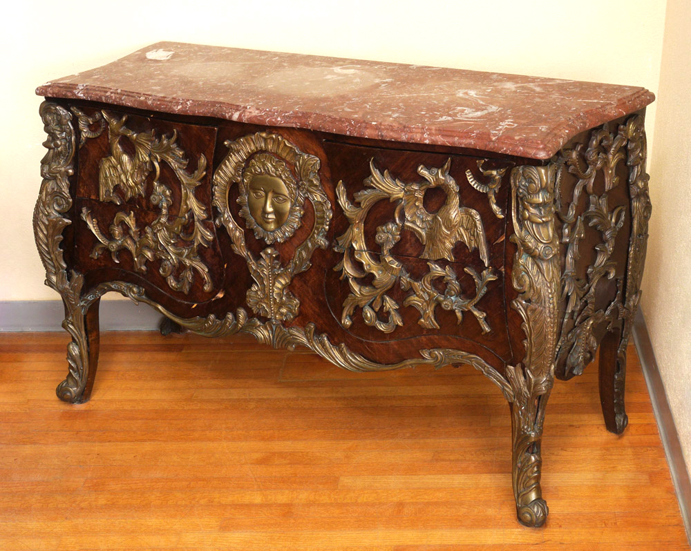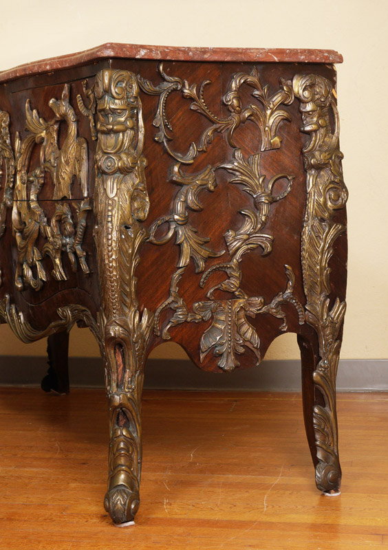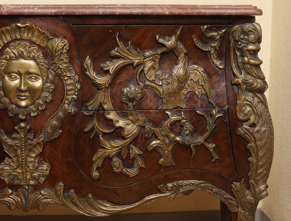 FRENCH STYLE ORMOLU MOUNTED MARBLE TOP CHEST: 20th century production, elaborate ormolu mounts all over with masquerons, dragons, and foliate motifs. Shaped marble top, overall measures 36'' x 56 1/2'' x 20 1/2''.