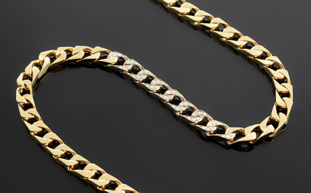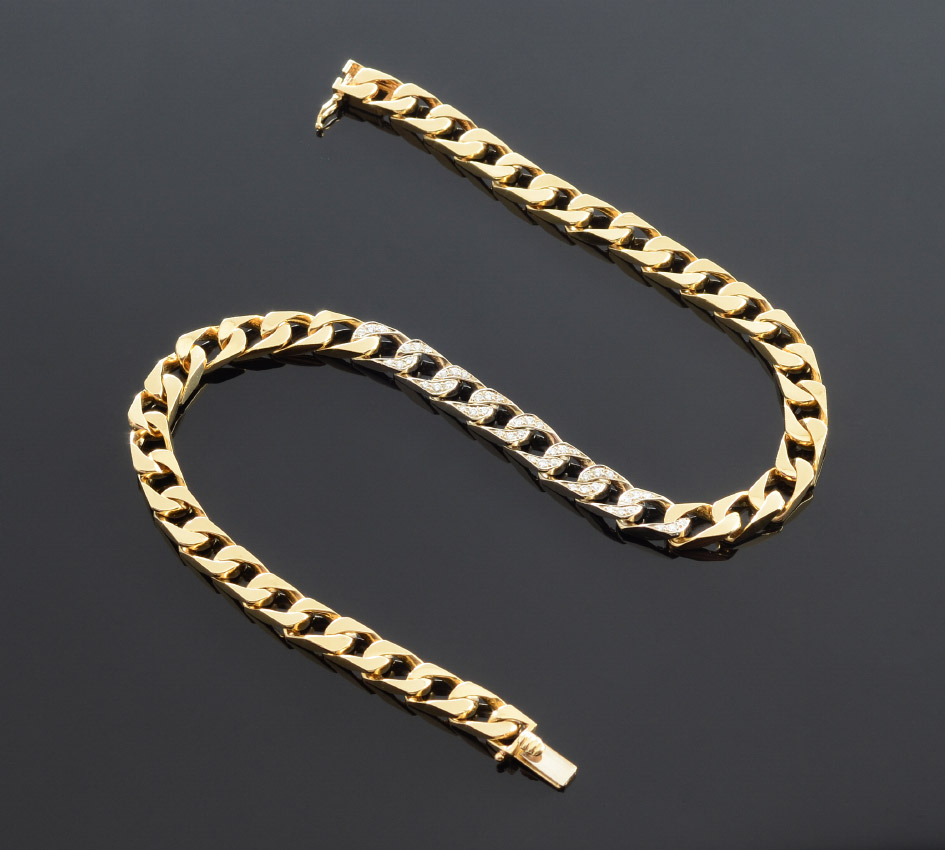 18K CUBAN LINK NECKLACE WITH DIAMONDS: 18K yellow gold links with the center links having deep set diamonds totaling approx. .70 Ct. Diamonds are set in white gold and are rated VS in clarity and G-H color. Length 15''. Width .25''. Weight 8.32 grams. Sold with current Atlanta Gemological GIA graduate's appraisal for $10,000.