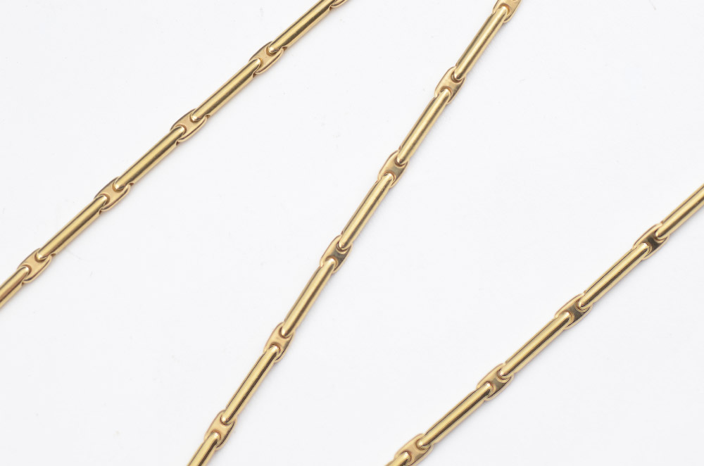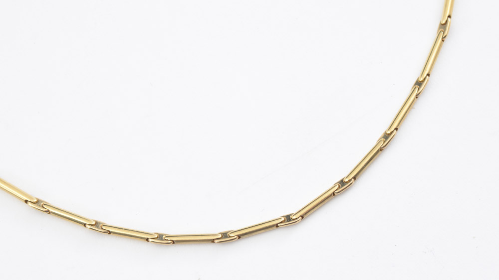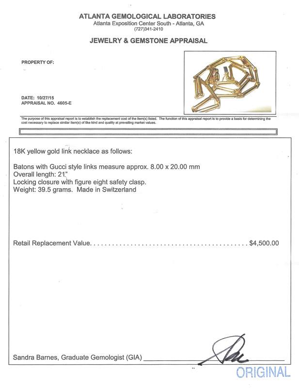 A FINE 18K SWISS MADE NECKLACE: Batons with Gucci style links. Well marked. Length 21''. Weight 39.5 grams. Sold with current Atlanta Gemological GIA graduate's appraisal for $4,500.
