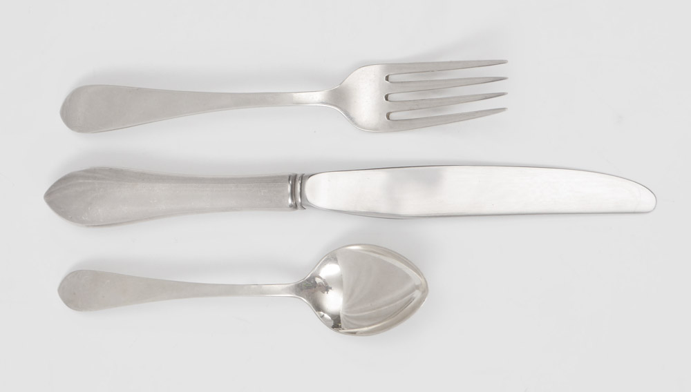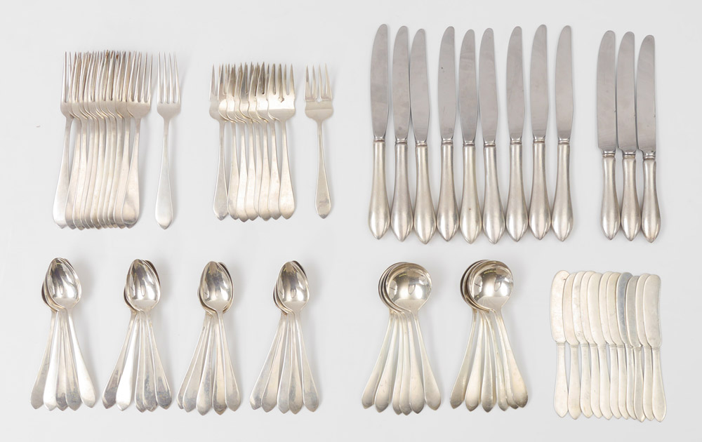 DOMINICK & HAFF POINTED ANTIQUE STERLING FLATWARE: Approx. 74 pieces in the Pointed Antique pattern to include 12 forks (7 1/4''), 9 salad forks (6 1/4''), 18 teaspoons (6 1/8''), 12 soup spoons (6''), 12 hollow knives (8 3/4''), 11 solid butter knives (5 7/8''). Approx. 76.8 troy oz.