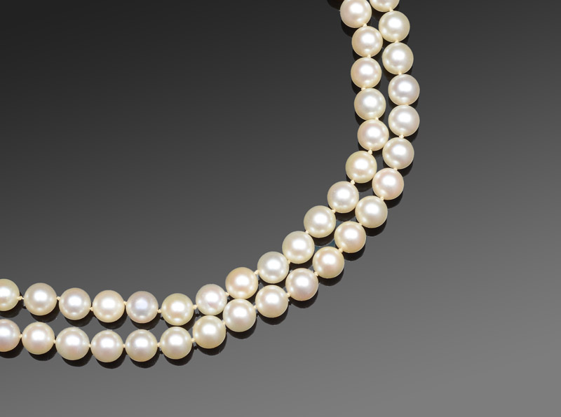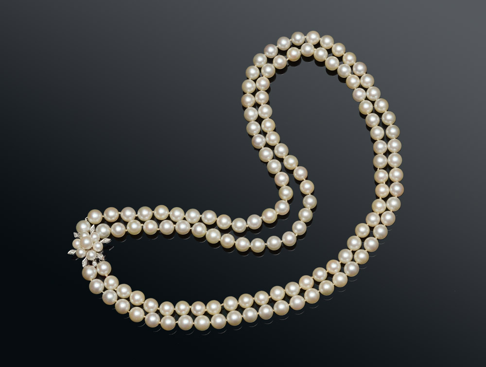 DOUBLE STRAND OPERA LENGTH AKOYA PEARL NECKLACE: 26'' strand of 8.00 mm Akoya cultured pearls. Cream in color, slightly blemished with high luster. The clasp is 14K white gold with 7 pearls and .05 Ct. diamonds.