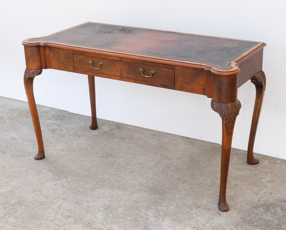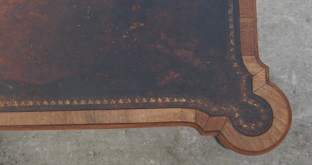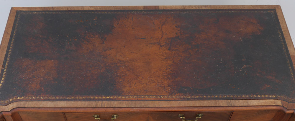 VICTORIAN LEATHER TOP WRITING DESK: Embossed inset leather top with cookie corners, flame mahogany veneer, skirt with single, shaped legs with carved knees, pad feet. Overall measures 30'' h. x 53'' x 24 1/2''.