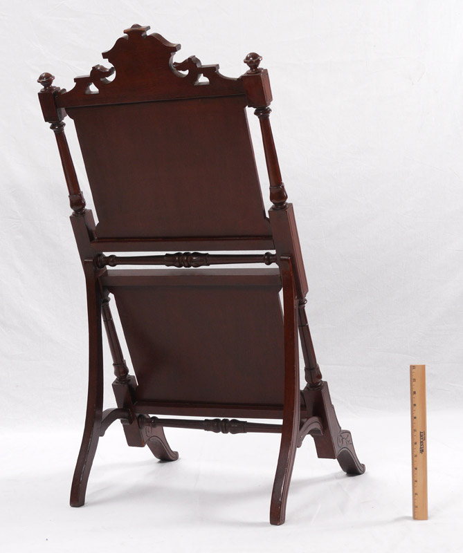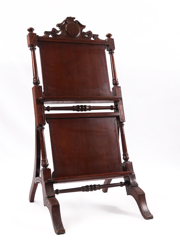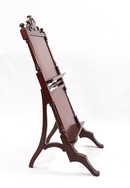VICTORIAN CARVED MAHOGANY EASEL: Carved and shaped crest, carved and turned supports, 2 shelves, overall measures 39 3/4'' h. x 21'' x 18 1/2''.
