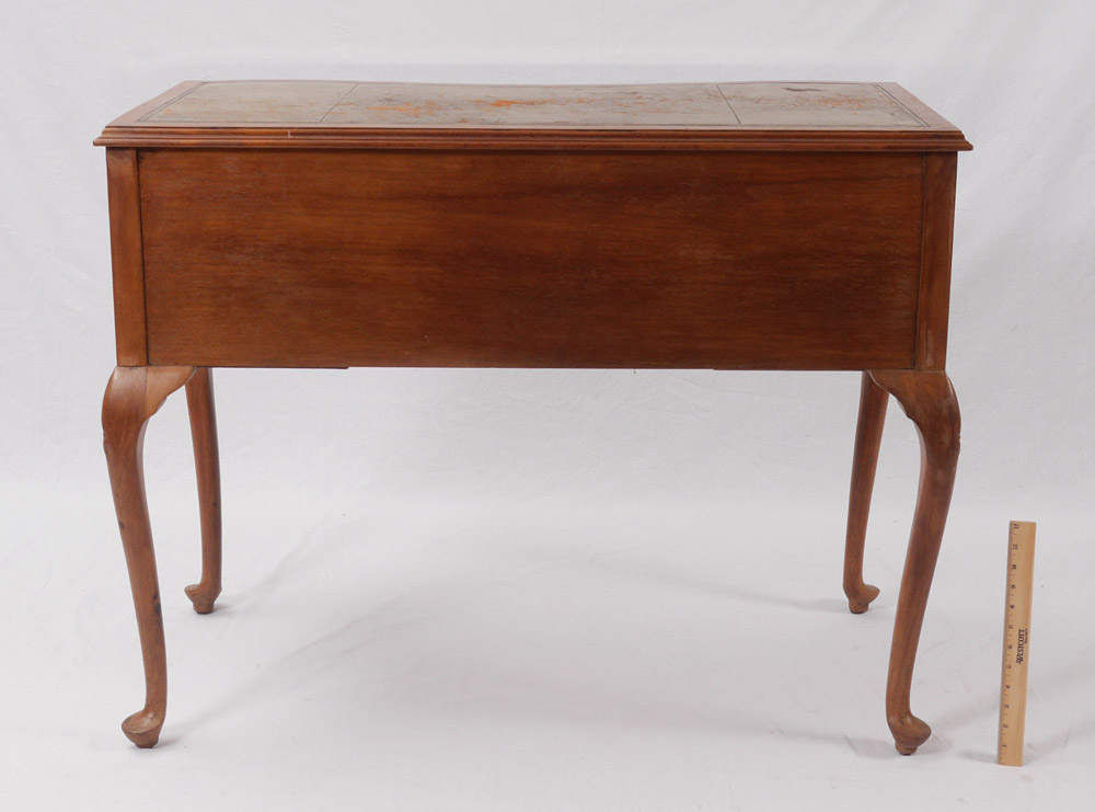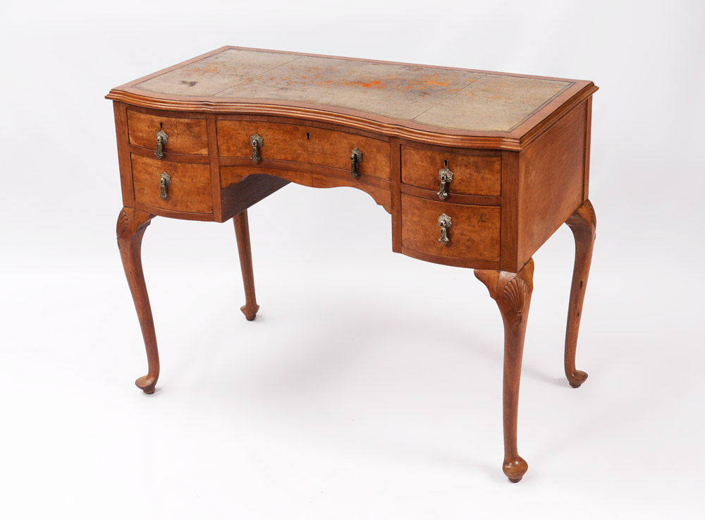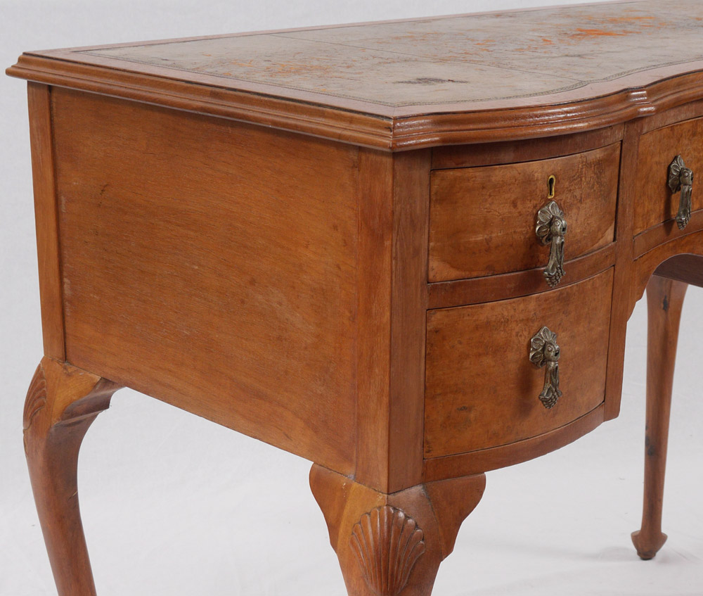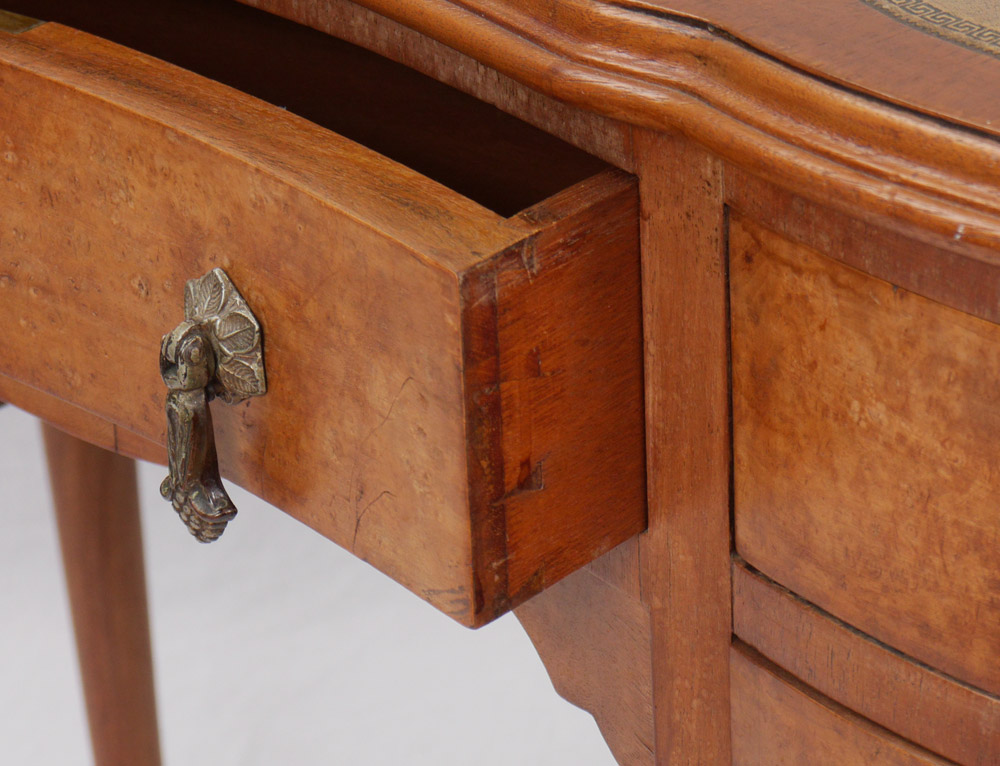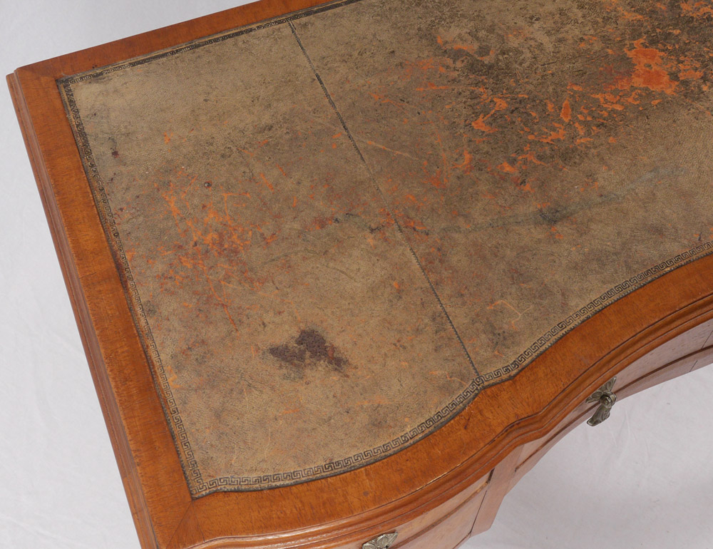 LEATHER TOP LOUIS XV STYLE WRITING TABLE: Serpentine top with embossed inset writing surface, front with single center drawer, 2 drawers either side, carved and shaped legs ending in pad feet. Overall measures 30 1/2'' h. x 39'' x 20 1/4''.