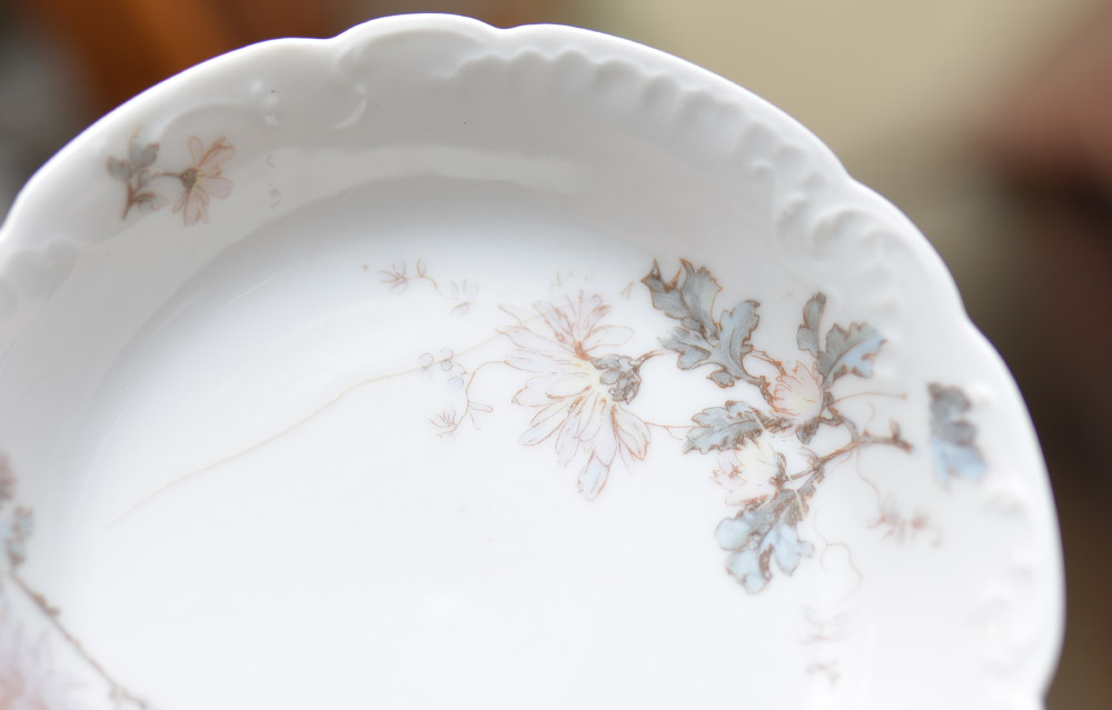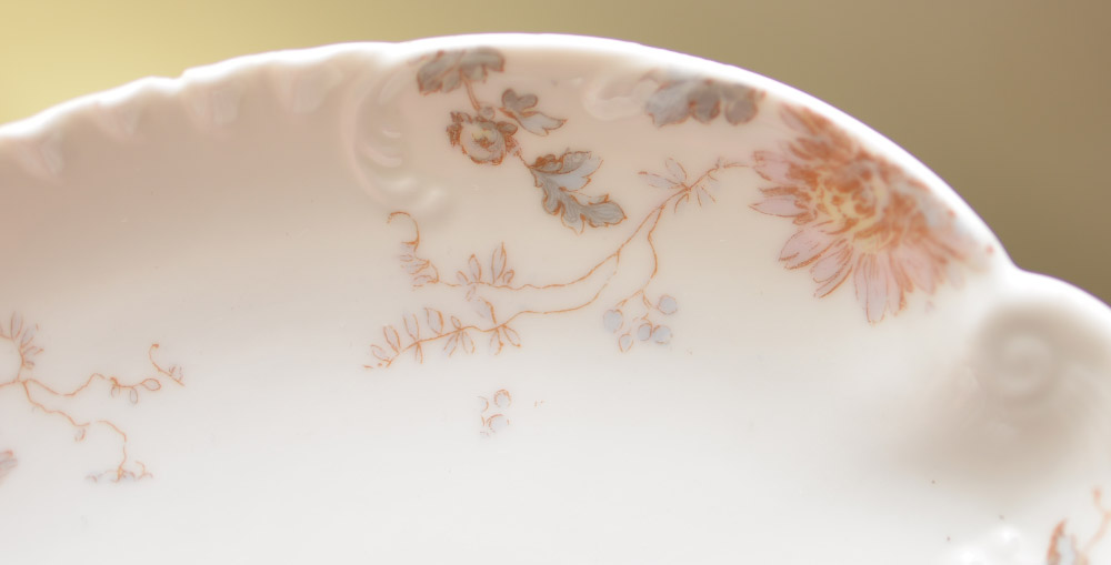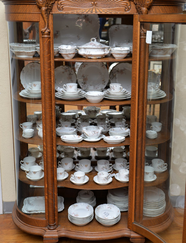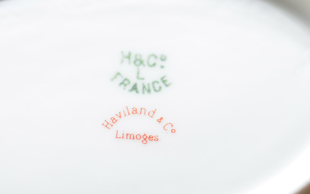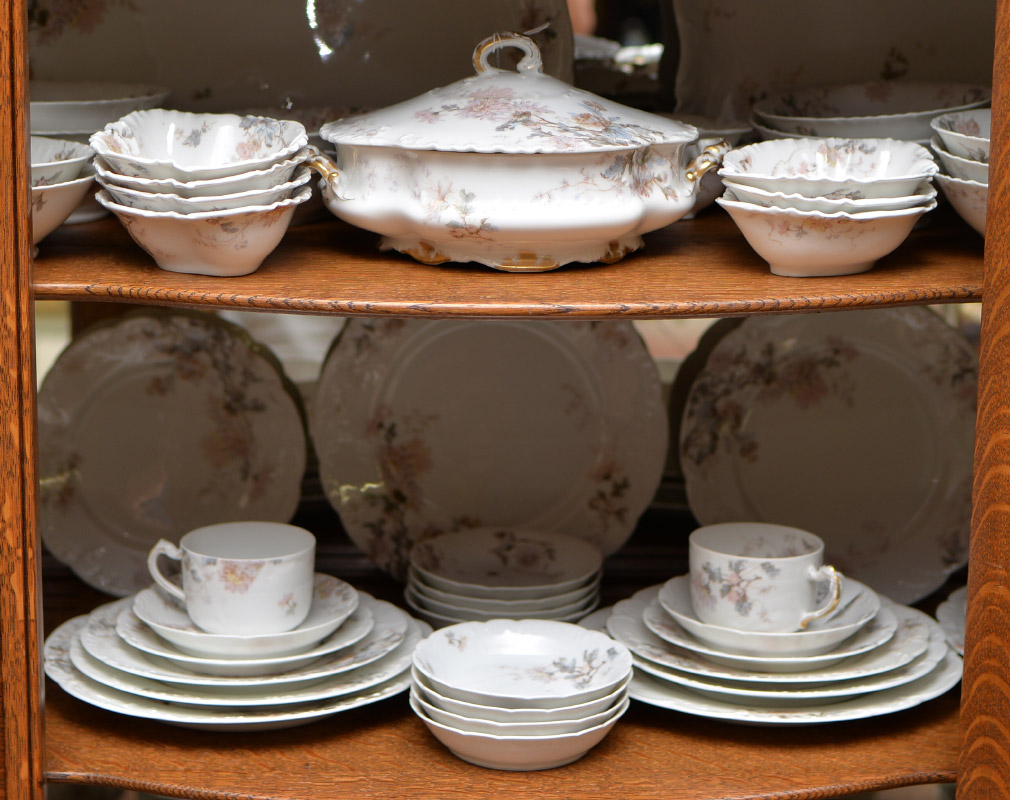 HAVILAND FRENCH LIMOGES CHINA SERVICE: Late 1800's. Approx. 140 pieces to include 10 dinner plates (9 1/2''), 11 salad plates (8 1/2''), 6 luncheon plates (9''), 11 bread plates, 11 soup bowls, 11 cereal bowls, 13 dessert bowls, 10 cups, 10 saucers, 11 butter pats, 11 fruit bowls, 12 side dishes, gravy, creamer, sugar, 4 open vegetable, 1 covered vegetable, 4 rectangular platters (18'', 12'', 10'').