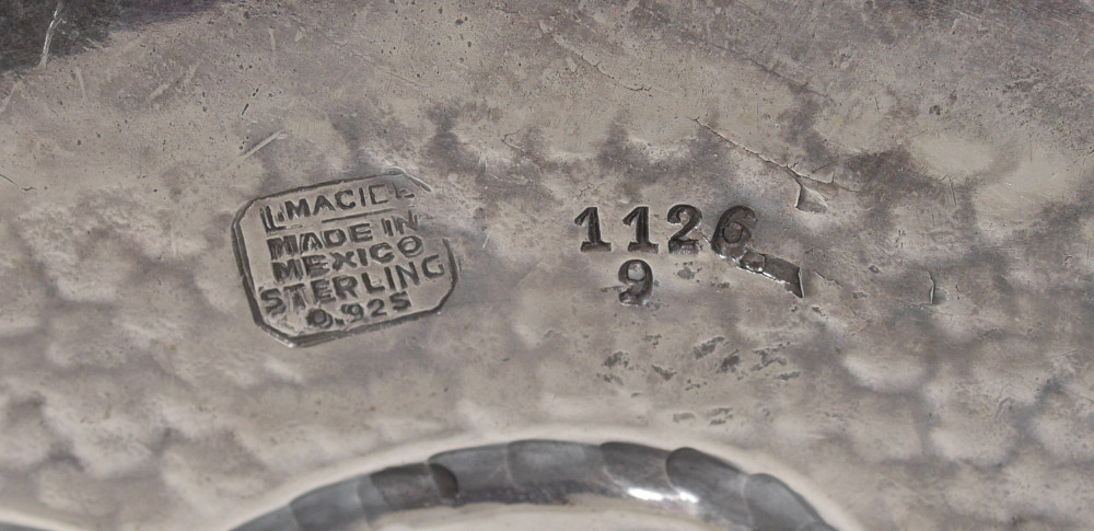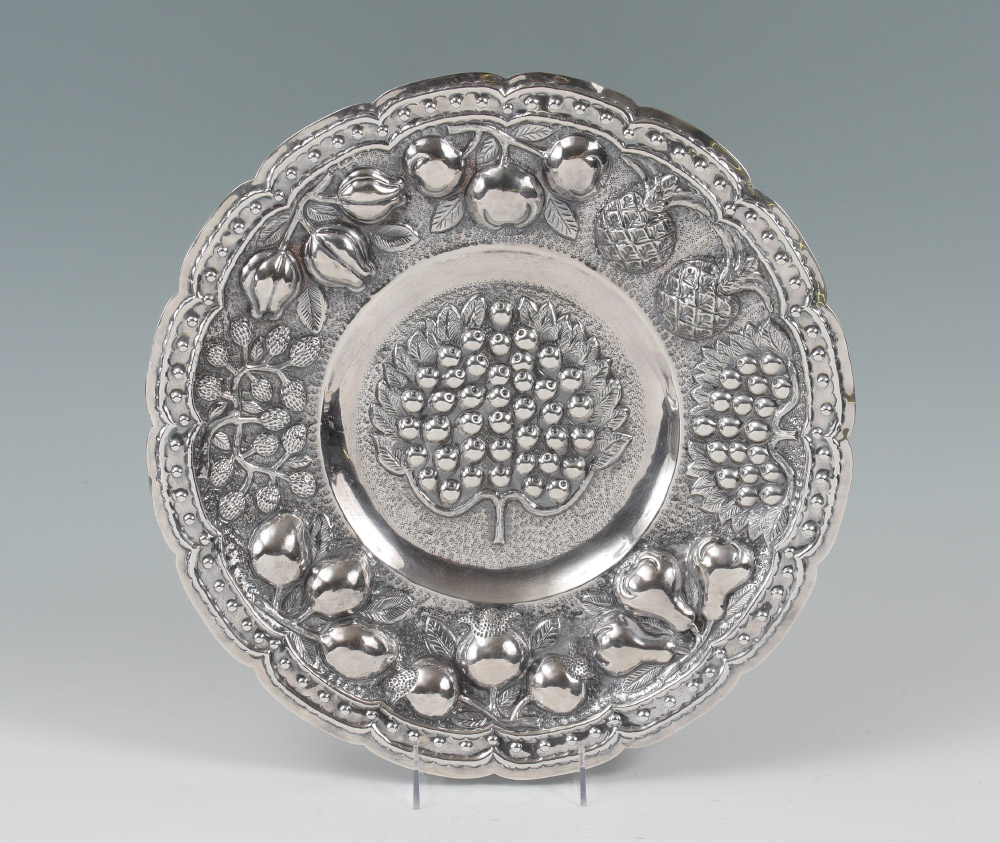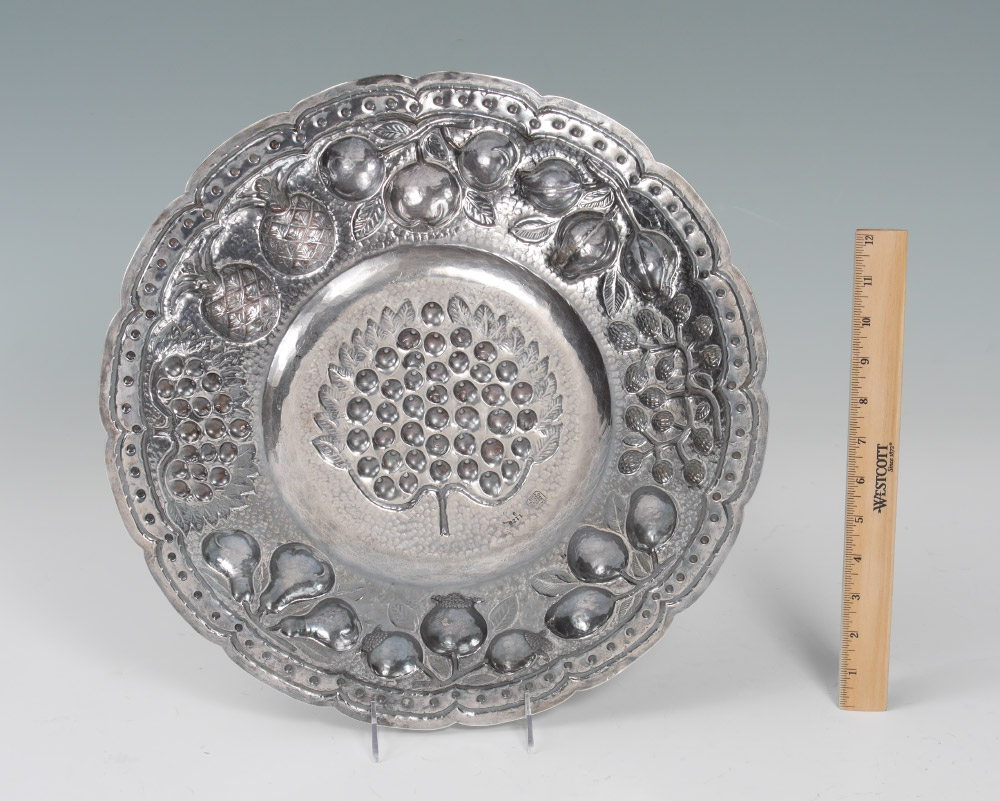 L. MACIEL MEXICAN STERLING REPOUSSE FRUIT PLATTER: Platter or charger with repousse fruit motifs, marked on back with ''L. Maciel, Made in Mexico, Sterling, 0.925'' and numbered 1126. Measures 1 1/2'' x 16'' dia., approx. 42.5 troy oz.