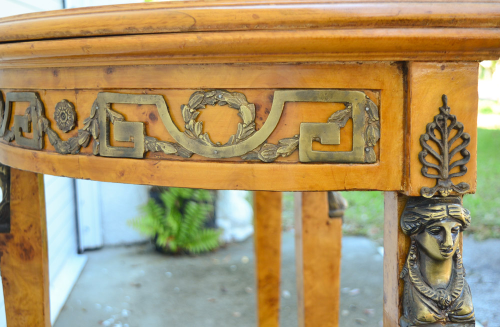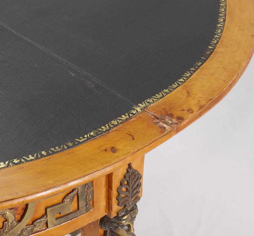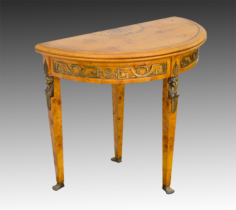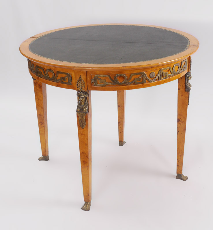 ORMOLU MOUNTED DEMI LUNE GAME TABLE: Paint decorated maple top flips open with gate leg to reveal embossed leather playing surface. Skirt with ormolu mounts, figural caryatid busts at joints of legs, ormolu figural feet feet. Closed measures 32'' h. x 38 3/4'' x 20''.