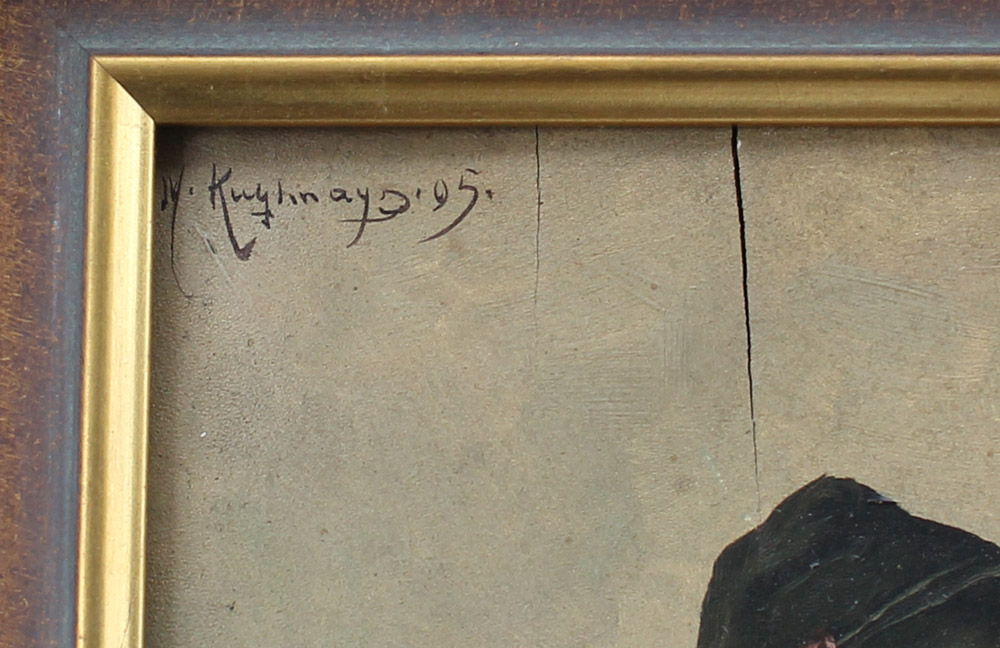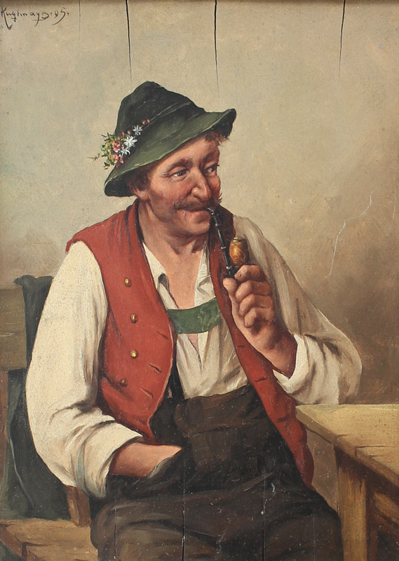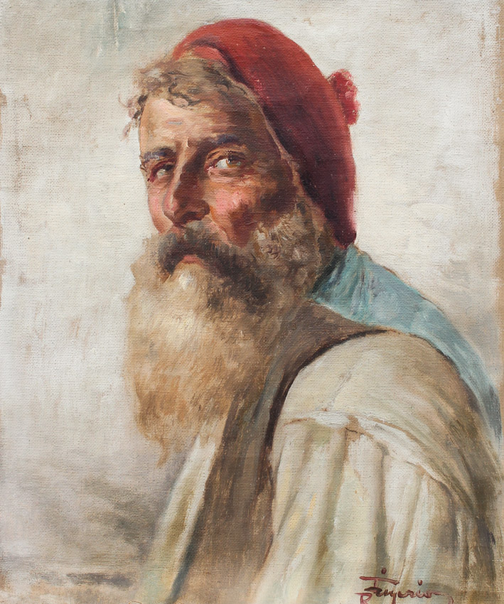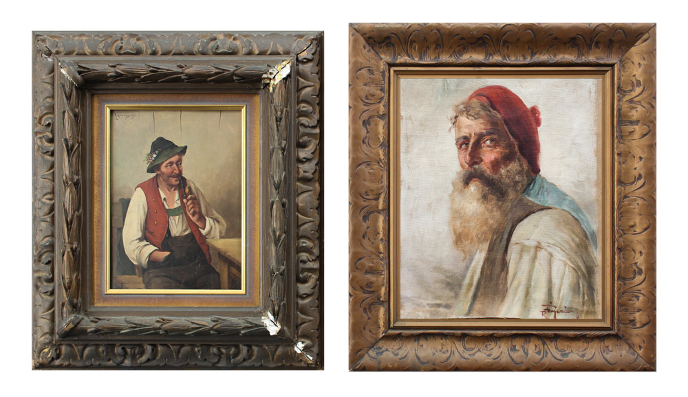 2 PAINTINGS; ILLEGIBLE SIGNED PIPE SMOKER AND RAFAELLE FRIGERIO: 1) Seated German Pipe Smoker in an Interior, Oil/Wood, sight size is 10.25'' x 11.5'', signed upper left, framed, 19.75'' x 17.25''; 2) FRIGERIO, Rafaelle, (Italian, 1875-1948): Bearded Italian Fisherman, Oil/Canvas/Board, 14'' x 12'', signed, painted gesso frame, 19.5'' x 17.25''.