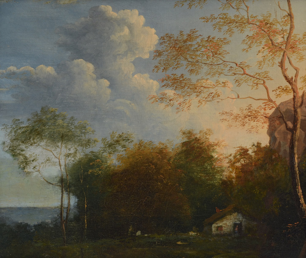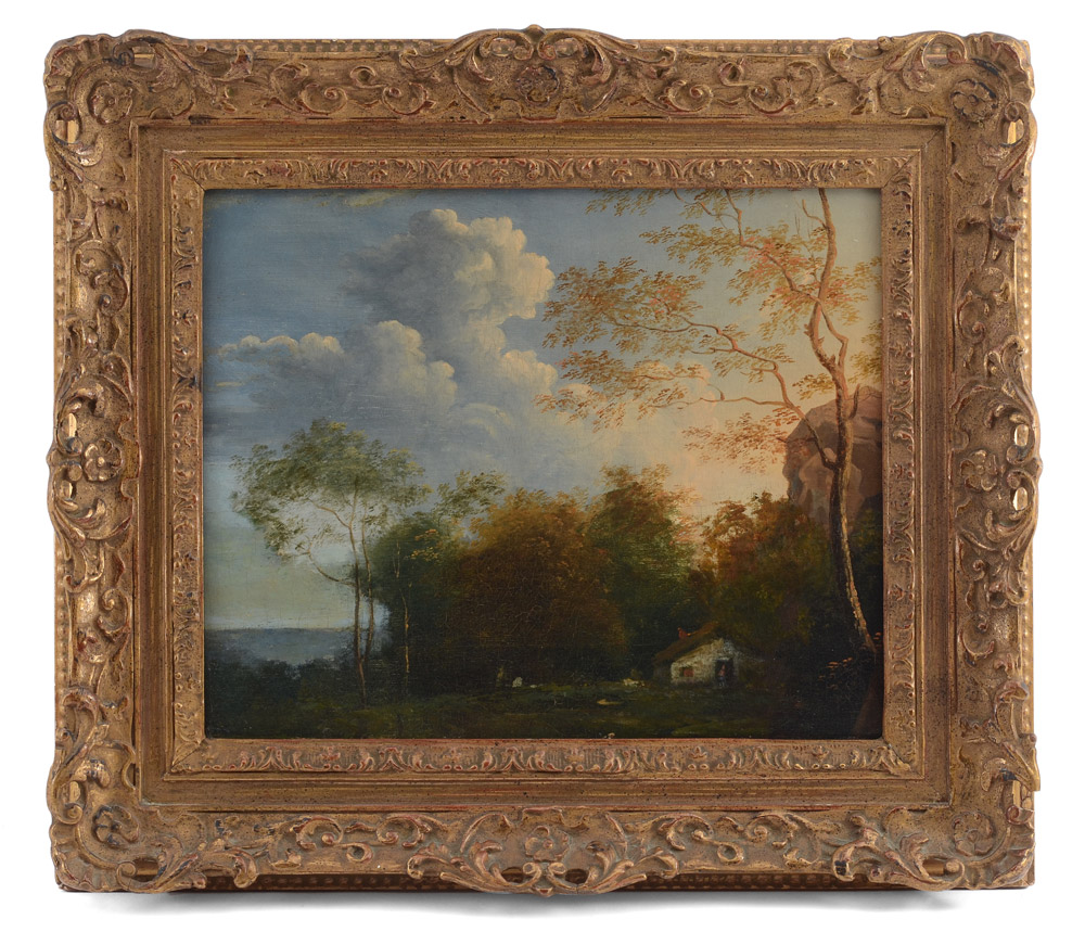 GOOD 19TH CENTURY ROMANTIC LANDSCAPE PAINTING WITH COUNTRY HOME: Oil/Canvas, 11 1/4'' x 13 3/4'', no visible signature, pierced, carved and gilded gesso frame, 17'' x 19 1/4''.