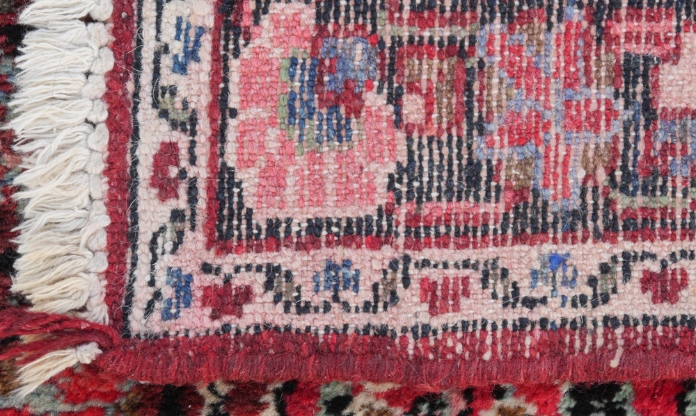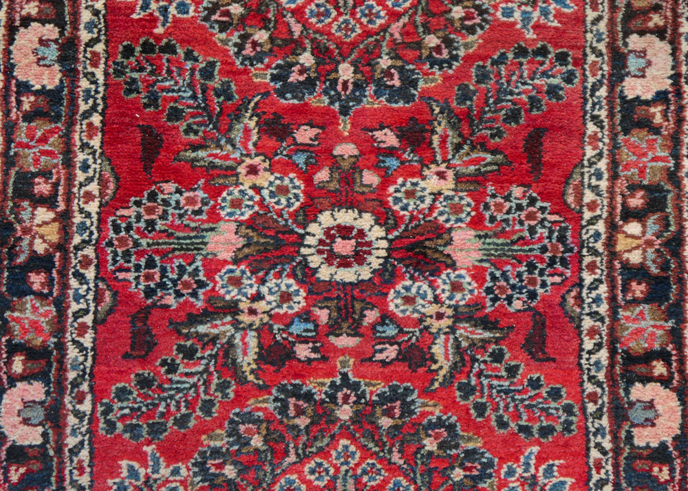 SEMI-ANTIQUE 60-85 YRS. OLD PERSIAN LILLIHAN HAND KNOTTED WOOL RUG, 2'7'' x 8'2'': Persian Lillihan rugs are attractive yet durable rugs that often are woven in traditional Sarouk designs. This one is no exception. The colors, especially the red field and the patterns of sprays of various flowers radiating out from the center of the rug, make most people think they are looking at a Sarouk instead of its cousin a Lillihan. The two are often used together with Lillihans filling in for Sarouks that can't be found or in high traffic areas. Condition is good.