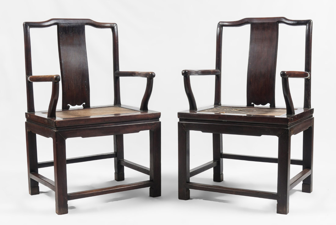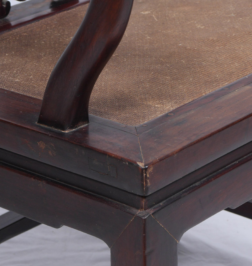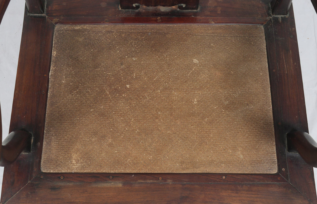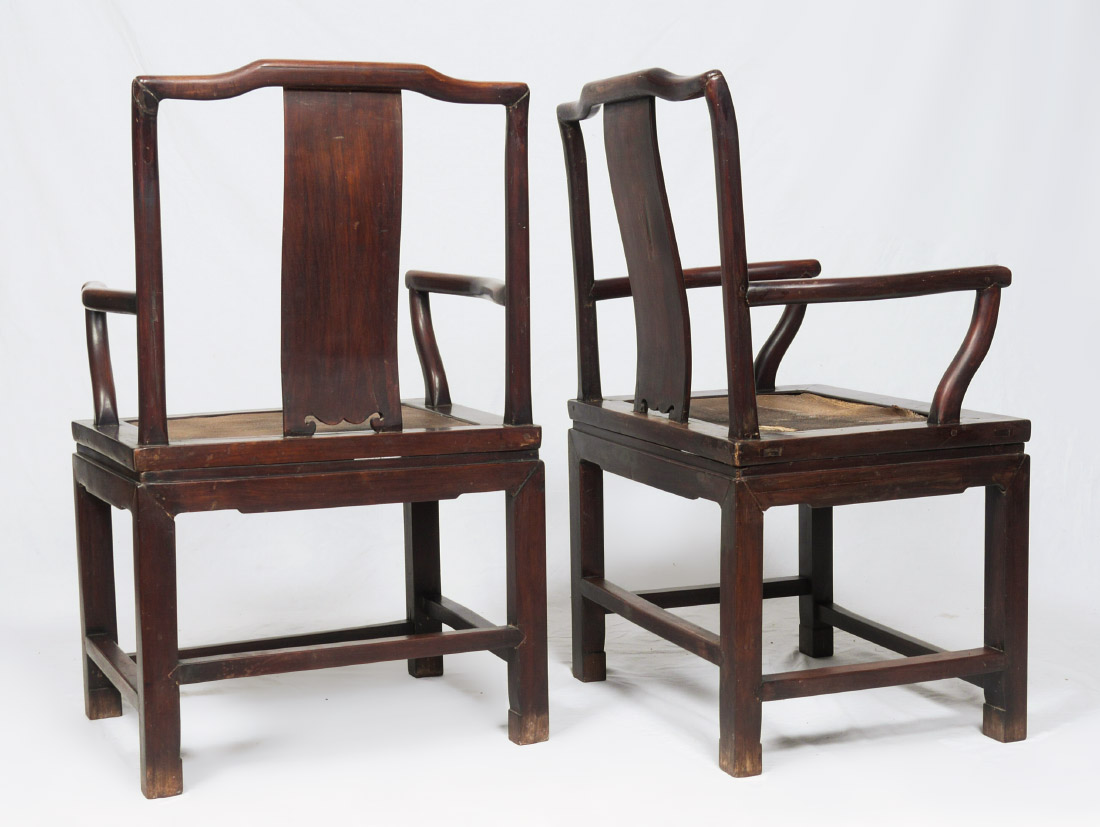 PAIR CHINESE ROSEWOOD ARM CHAIRS: Heavy rosewood, shaped crest, arms, back splat. Squared base with woven seat. Overall 39 1/2'' h. x 25 3/4'' x 19 1/2''. Former property of a US Foreign Service Officer living in Post-War China (1945-).