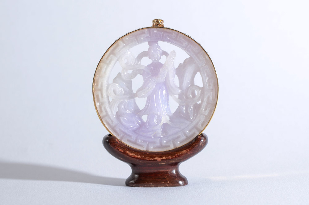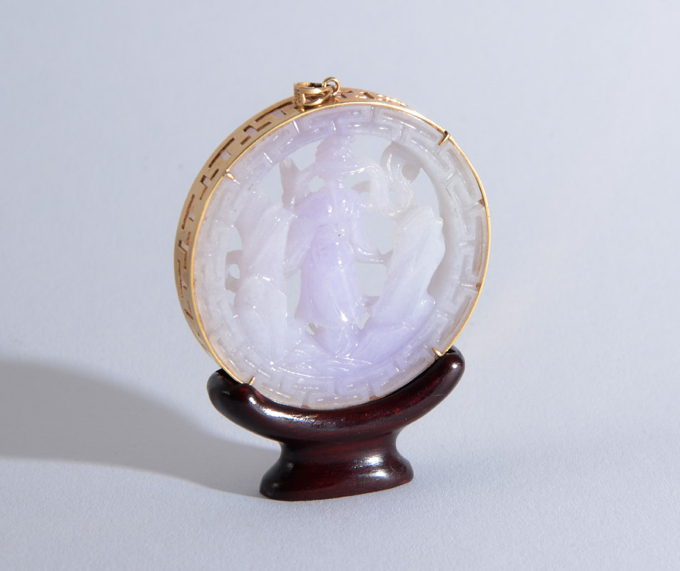 CARVED JADE PENDANT: LAVENDER JADE PENDANT: 14K yellow gold frames carved light lavender jadeite. 2.25'' diameter. Gold Weight: 10.0 grams approx.