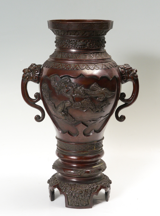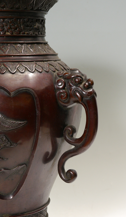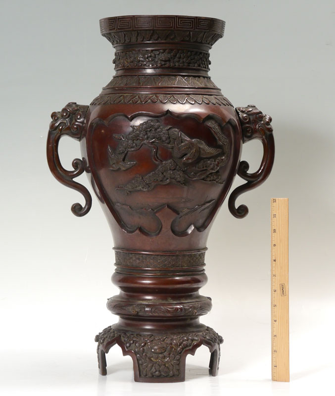 MEIJI PERIOD JAPANESE BRONZE FLOOR VASE: Figural dragon head handles, scene of birds in branches either side, shaped base. Overall measures approx. 24''h. x 16''.