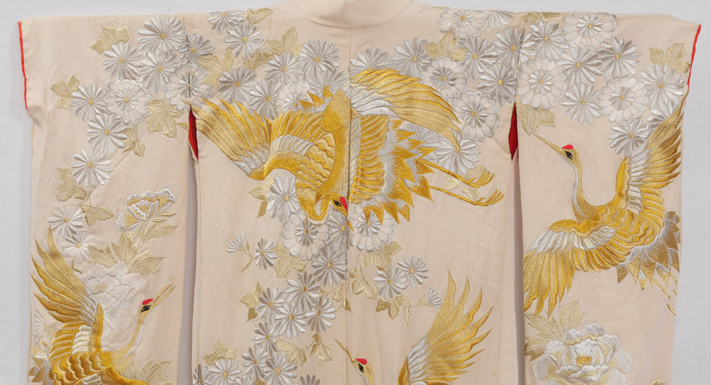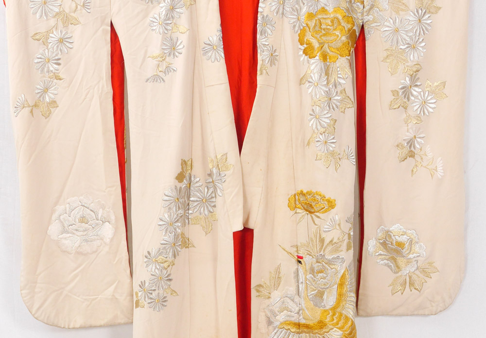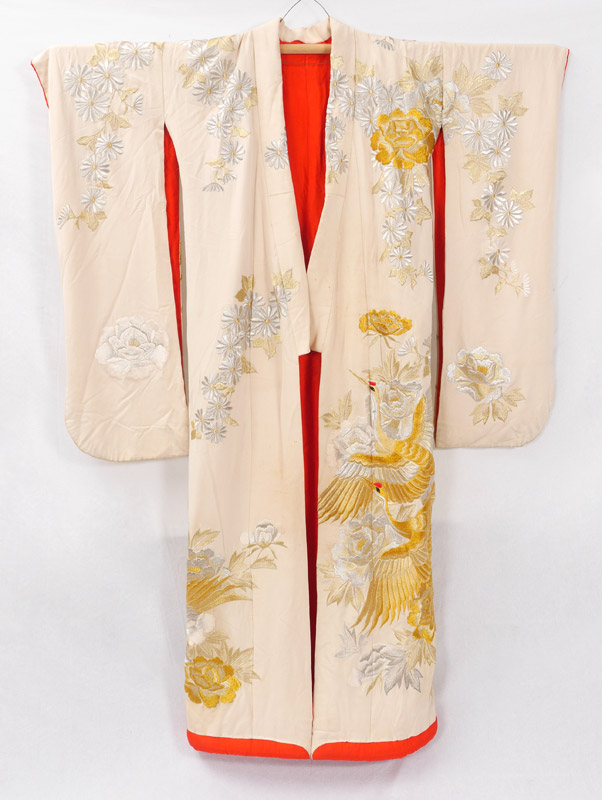 JAPANESE WEDDING KIMONO: Cream silk exterior with metallic thread cranes and floral motifs. Red silk interior, overall measures approx. 72'' long x 50'' shoulder to shoulder.