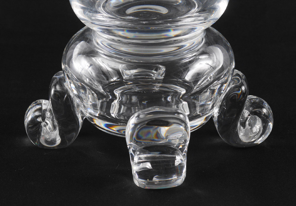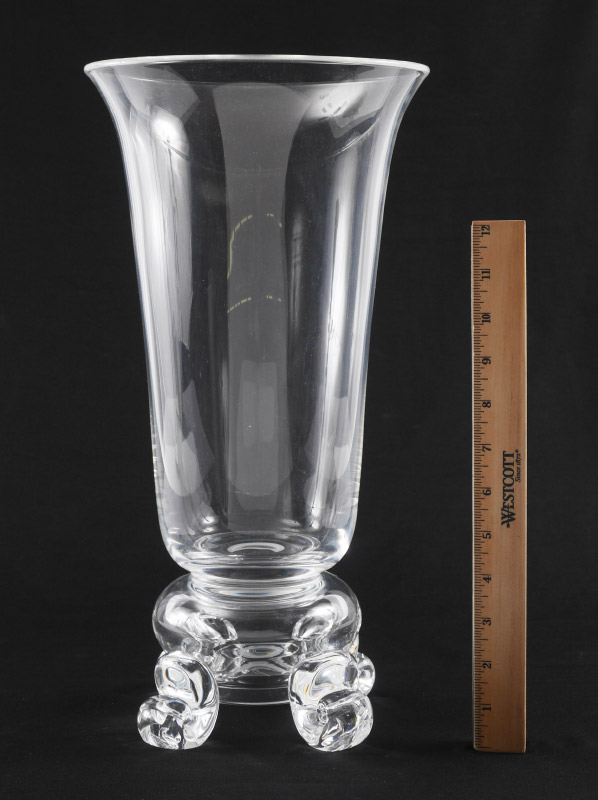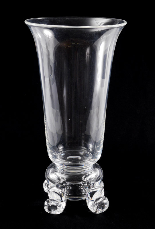 STEUBEN CRYSTAL TALL VASE #7901: Large vase with flared rim, pinched base with scroll feet. Etched Steuben signature, sold with letter from Steuben dated 1993 identifying the vase as pattern #7901. 16'' h. x 8 1/4''.