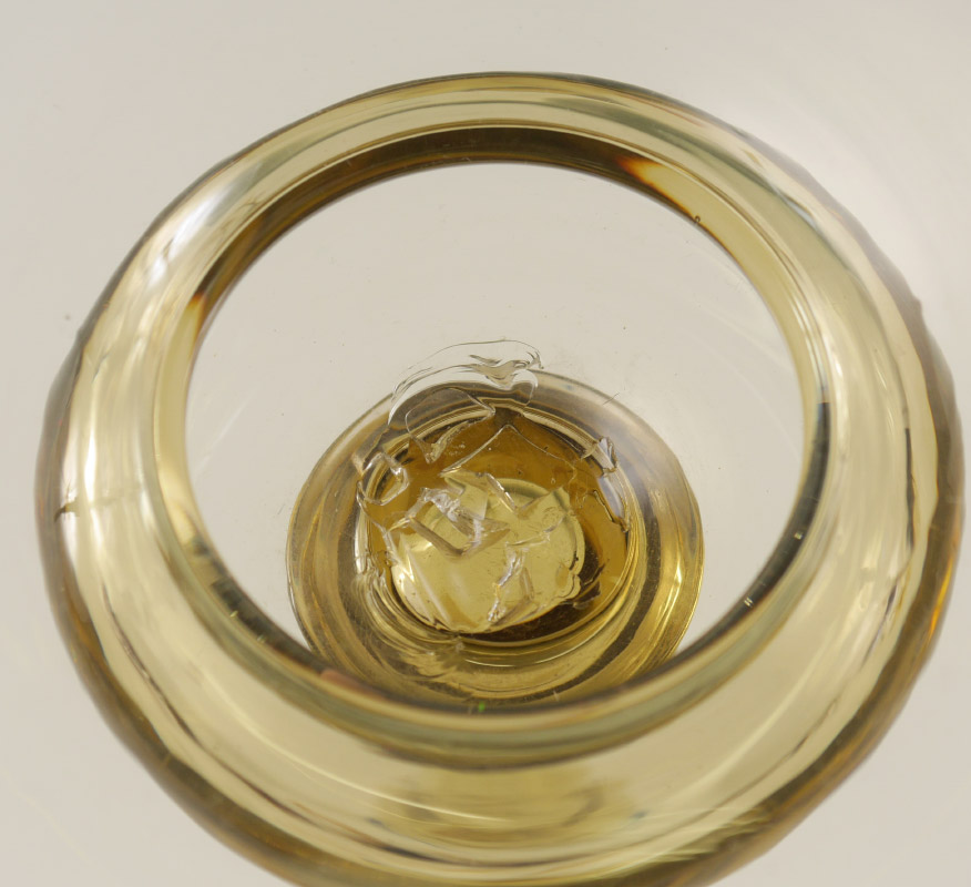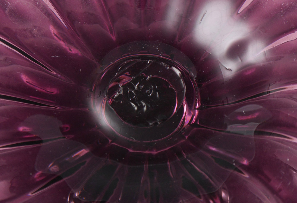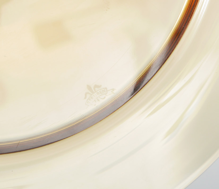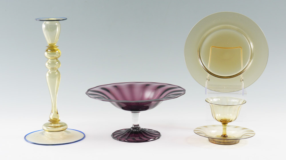 5 PIECE STEUBEN AMBER & AMETHYST GLASS: 5 pieces total to include 1) Amber candlestick with blue rims, 11 3/4'' h. x 6''. 2) Amber cup, 3 3/4'' h. 3-4) Marked amber bowl (5 7/8'') and underplate (8 5/8''). 5) Amethyst compote with clear stem, 4 1/2'' h. x 10''.