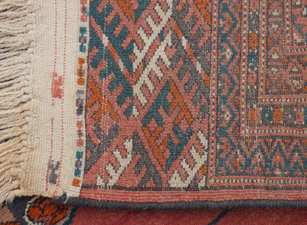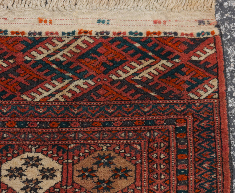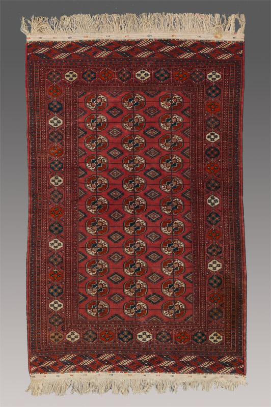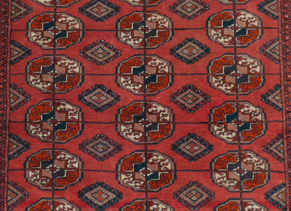 APPROX. 45-75 YR. OLD TURKOMAN BOKHARA HAND KNOTTED WOOL RUG, 4'3'' x 6'2'': This real Bokhara has a somewhat different use of the colors usually found on these rugs but the motifs are traditional. There are alternating rows of two different patterns of ''guls'', a small diamond shaped one and an oval gul that has four panels or quarters. These quarters are accentuated by blue lines that run through the rug and intersect in the center of each gul. The colors in the guls include a medium blue, rust, white and salmon. The salmon colored field is bordered by darker colored multiple small guard borders, a main border with another gul in panels and aprons at each end of the field. Condition is good.