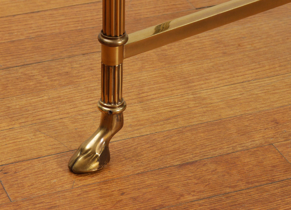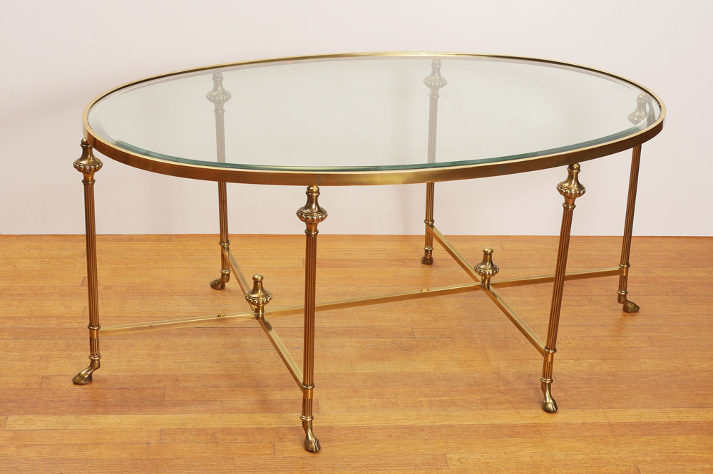 GIO PONTI BRASS BASE TABLE: Oval beveled glass over a brass base with hoof feet. Made in Italy label. Attribution. Measures approx. 22''h x 50'' x 32''.