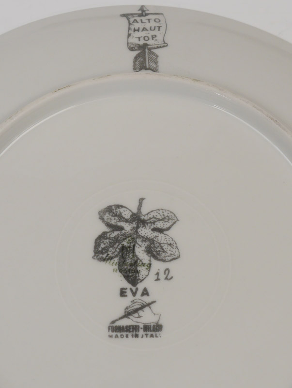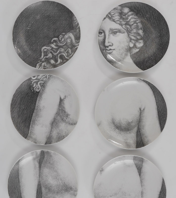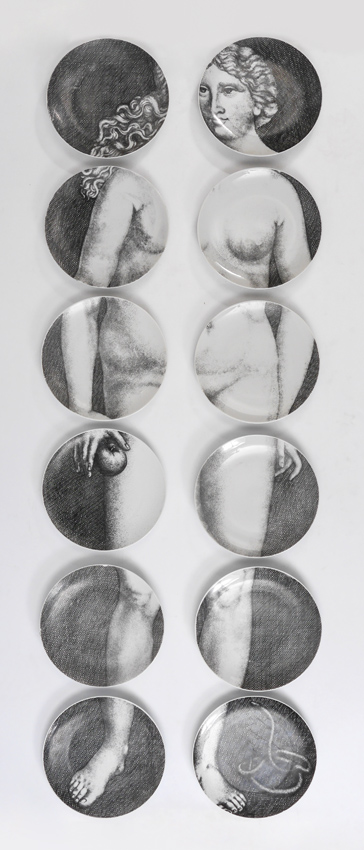 SET OF 12 PIERO FORNASETTI EVE PLATES: Series of 12 plates when displayed together depicts Eve. Black and white. Measure approx. 10'' dia.