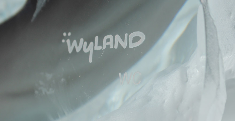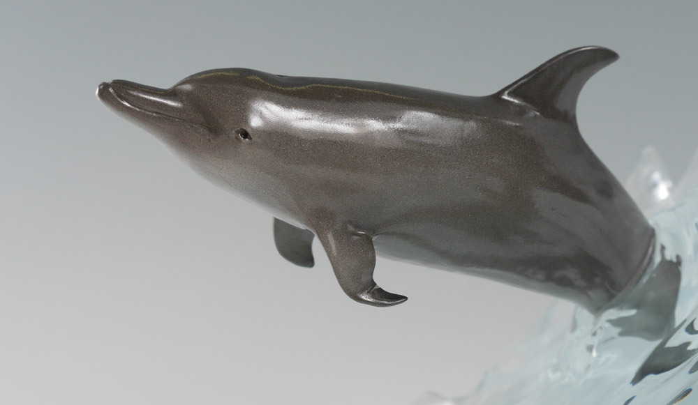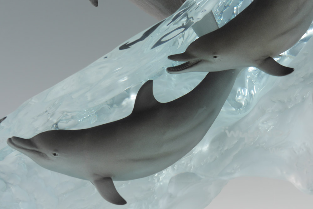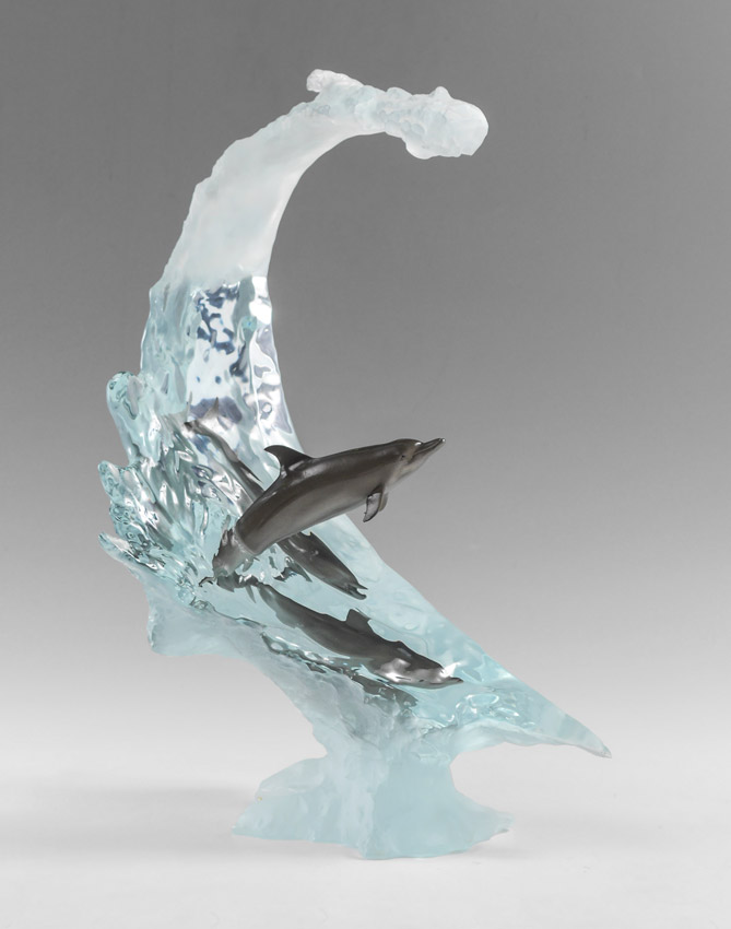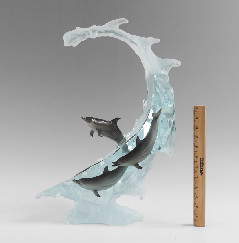 WYLAND, Robert, (American, 20th Century): Large wave with 2 dolphins inside, one leaping out, Acrylic, signed, 21 1/4'' x 15 1/2'' x 11 1/2'', marked WC.