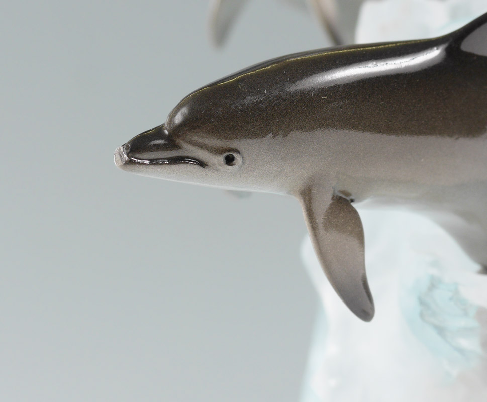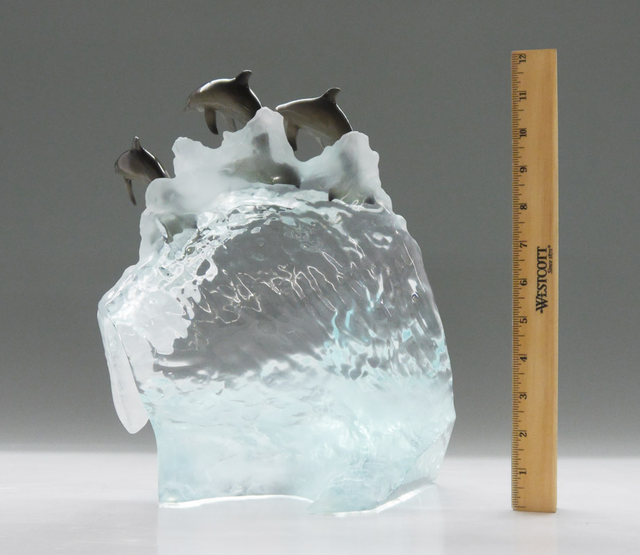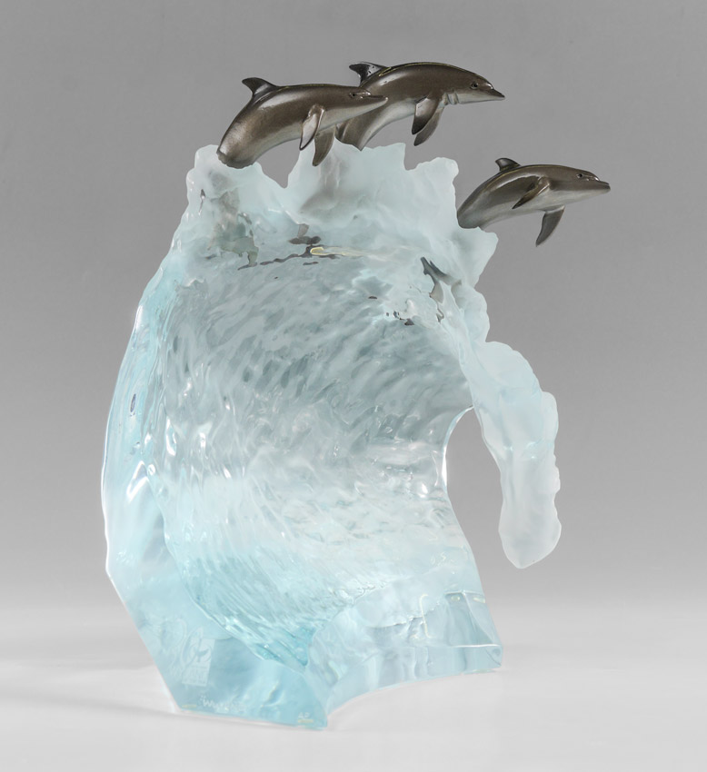WYLAND, Robert (American, 20th Century): Cresting wave with 3 dolphins leaping on top, Acrylic, signed and marked AP, 12'' h. x 11'' x 10''.