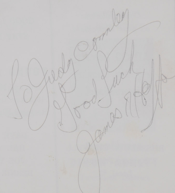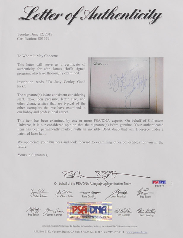 PSA/DNA JIMMY HOFFA FRAMED AUTOGRAPH: Signed on ''The Diamond Press'' stationary ''To Judy Conley, Good Luck, James R. Hoffa''. Paper sight size 8 1/2'' x 5 1/2'', framed and mounted with 2 pictures of Hoffa, overall measures 17'' x 27 3/4'' x 3/4''. Sold with PSA/DNA certificate affixed to back.