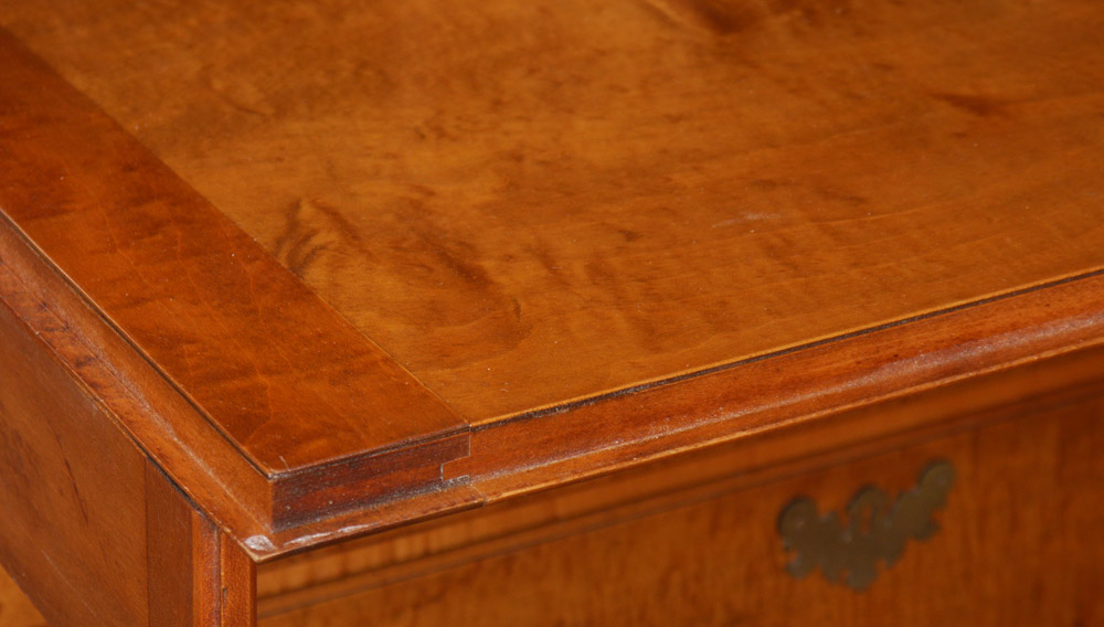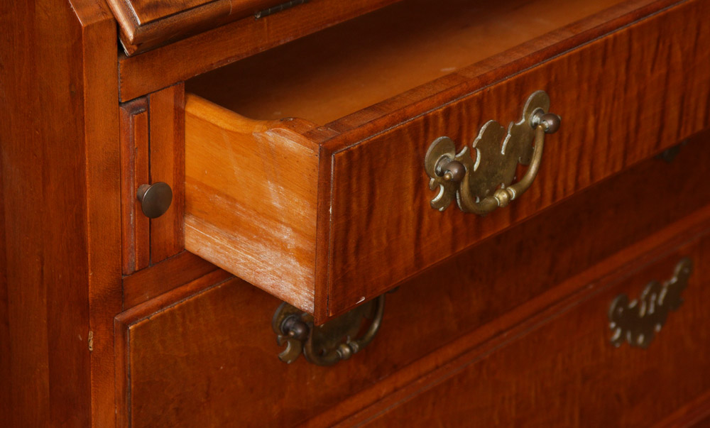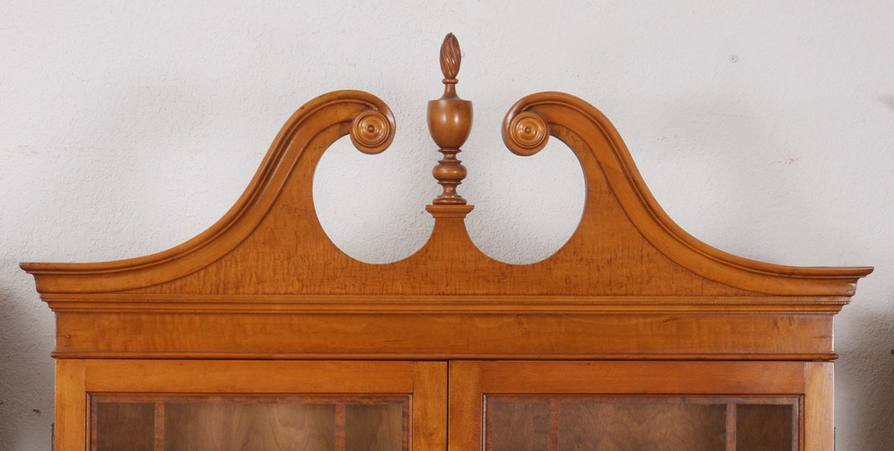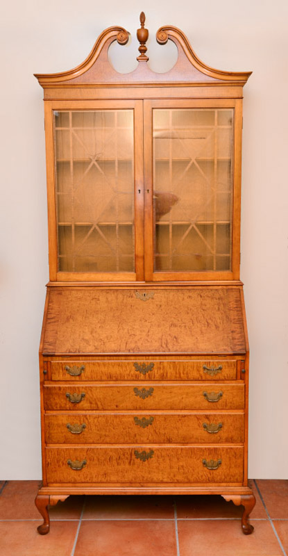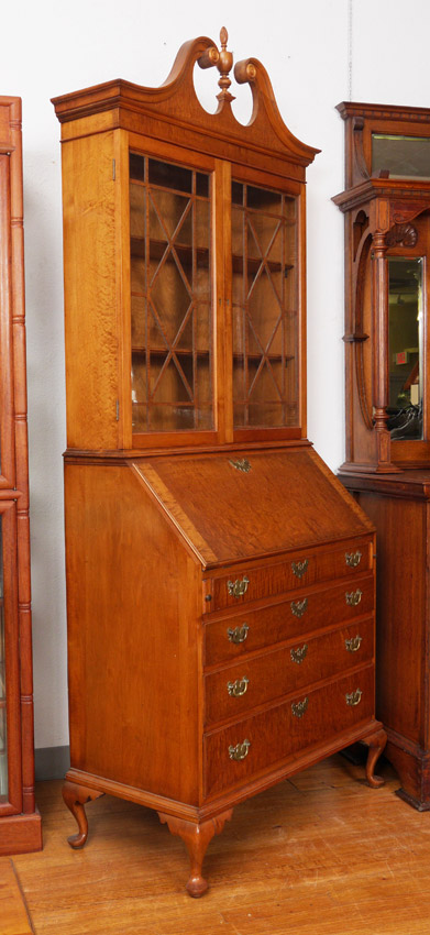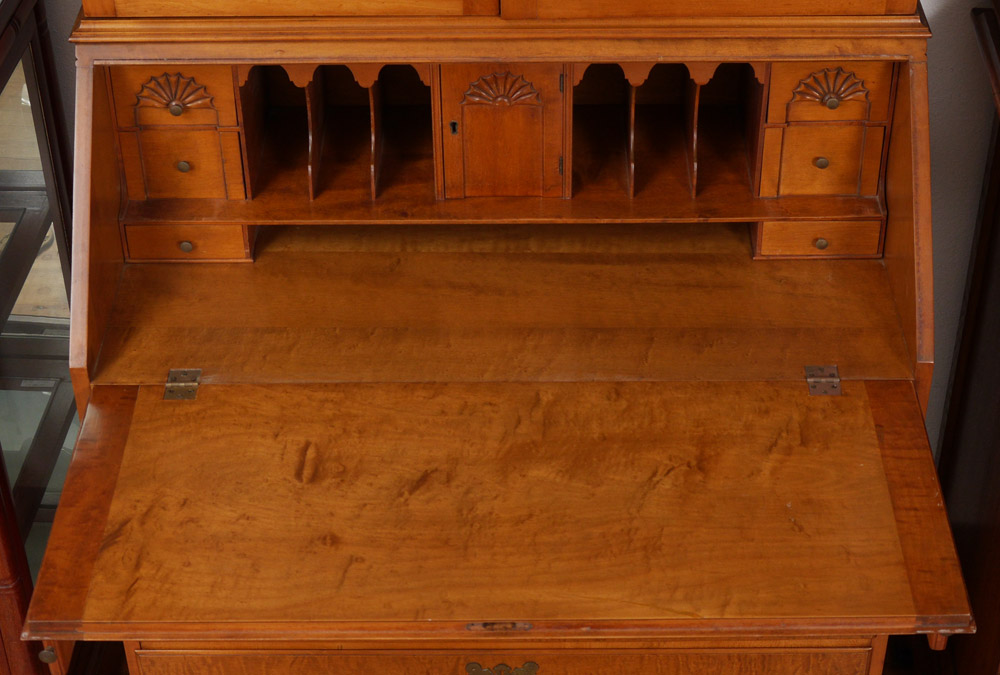 MAPLE GOVERNOR WINTHROP SECRETARY BOOKCASE: Swan neck broken arch pediment with urn finial, 2 glass doors with fretwork, 2 interior shelves. Slant front secretary opens to door and drawers with carved fronts, pigeon holes with shaped valences, over 4 graduating full length drawers, all on pad feet. Overall measures 87'' h. x 34'' x 18 1/2''.