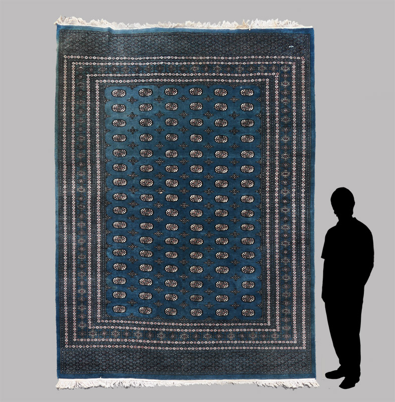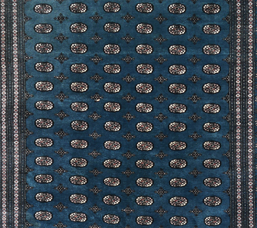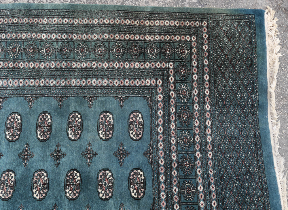 APPROX. 20-35 YR. OLD PAKISTANI BOKHARA HAND KNOTTED WOOL RUG, 8'8'' x 11'8'': This room size rug has a deep turquoise colored ground that is covered with alternating rows of two ''guls'' - the traditional motifs found on Bokhara rugs. There are multiple (9) small borders and an ''apron'' or additional border at each end. There is a small signature cartouche in one of the aprons.