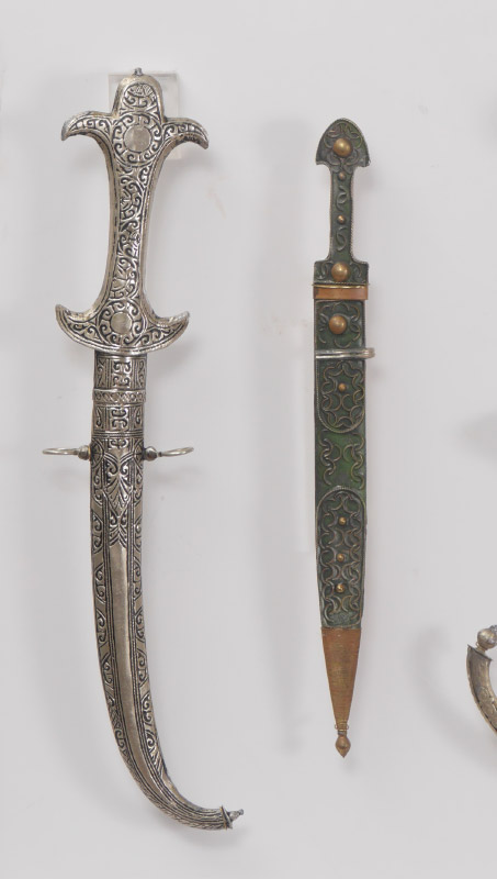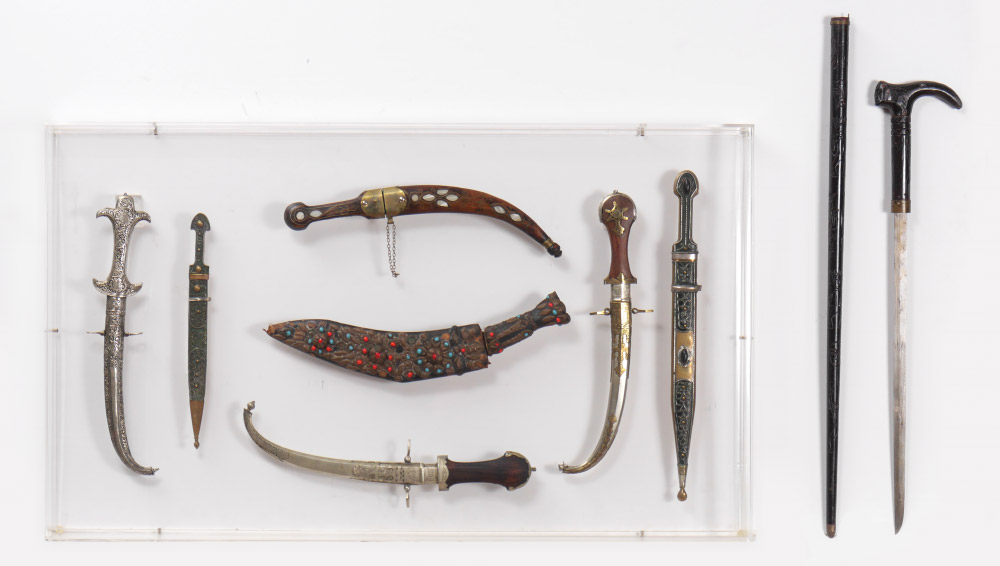 COLLECTION OF 7 KINDJAL DAGGERS IN LUCITE DISPLAY: Collection of 7 assorted kindjal and middle eastern daggers, all encased in a Lucite display box, 24'' h. x 40 1/4'' x 30 1/4''. Sold with a Mexican carved sword cane, overall 37 1/2'' long.