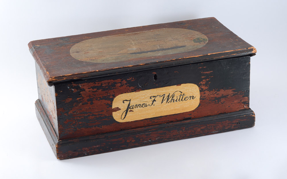 19TH CENTURY PAINT DECORATED SEAMAN'S CHEST: Paint decorated all over, hinged lid with schooner near shore, front identified with James F. Whitten, foliate decoration on sides. We have located a James Whitten, Civil War sailor who served on the CSS Virginia II, however we cannot confirm this as his. Interior with box, lock not working, overall measures 8 1/2'' h. x 20 1/2'' x 11''.