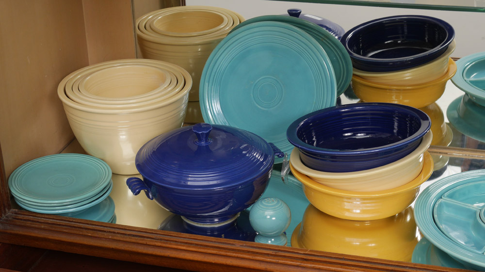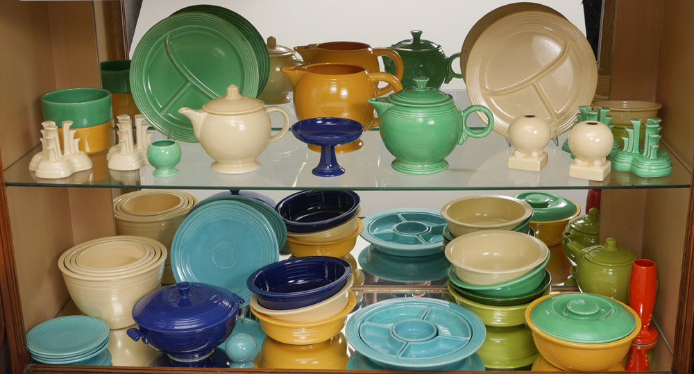 LARGE COLLECTION FIESTA WARE BY HOMER LAUGHLIN: Approx. 40 pieces, all but 2 in original colors. To include Nest of 4 mixing bowls in ivory, turquoise relish tray with inserts, 2 pair tripod candle holders, pair bulb candle holders, cobalt covered casserole, green ring handle teapot, ivory teapot, yellow pitcher with ice lip, 2 stacking bowls, green mustard (no lid), a green and an ivory divided grill plate, cobalt comport, yellow serving bowl with green lid, 7 nappy bowls (8 1/2'' dia.), 2 nappy bowls (5 1/4'' dia.), turquoise shaker, 3 turquoise saucers, and a bread plate, a turquoise 9'' plate, chartreuse teapot and a modern red vase.