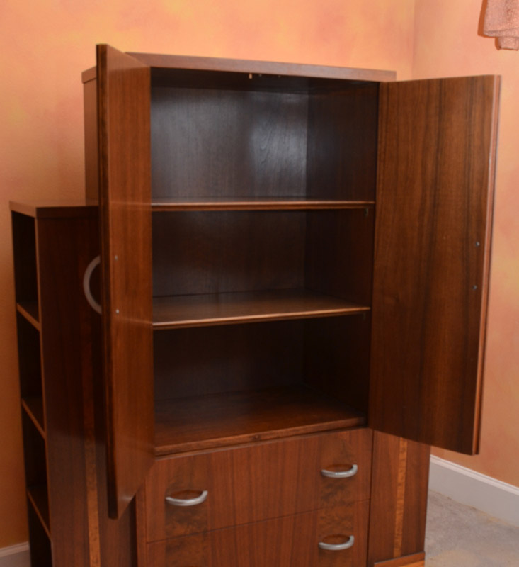 PAUL FRANKL / JOHNSON SKYSCRAPER SIDE CABINET: Attributed to Paul Frankl by Johnson Handley Johnson. Mahogany with burl accents, 2 doors over 2 drawers with outward facing side shelves. Measures 55 1/4'' h. x 40 1/4'' x 16 1/2''.