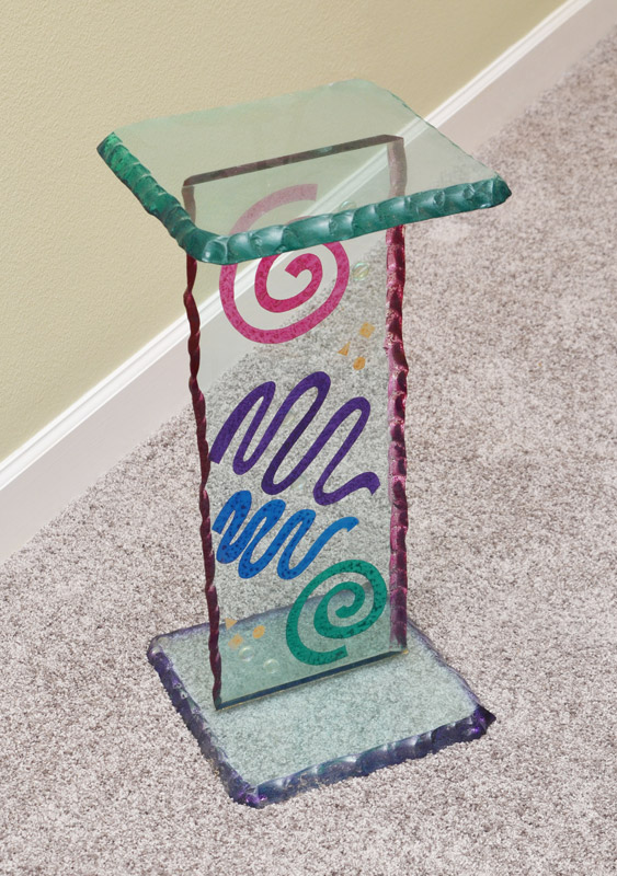 SMALL ART GLASS PEDESTAL / PLANT STAND: Glass top, support and base with chipped and painted edges, support with designs. Measures 24 1/2'' x 11 1/2''.