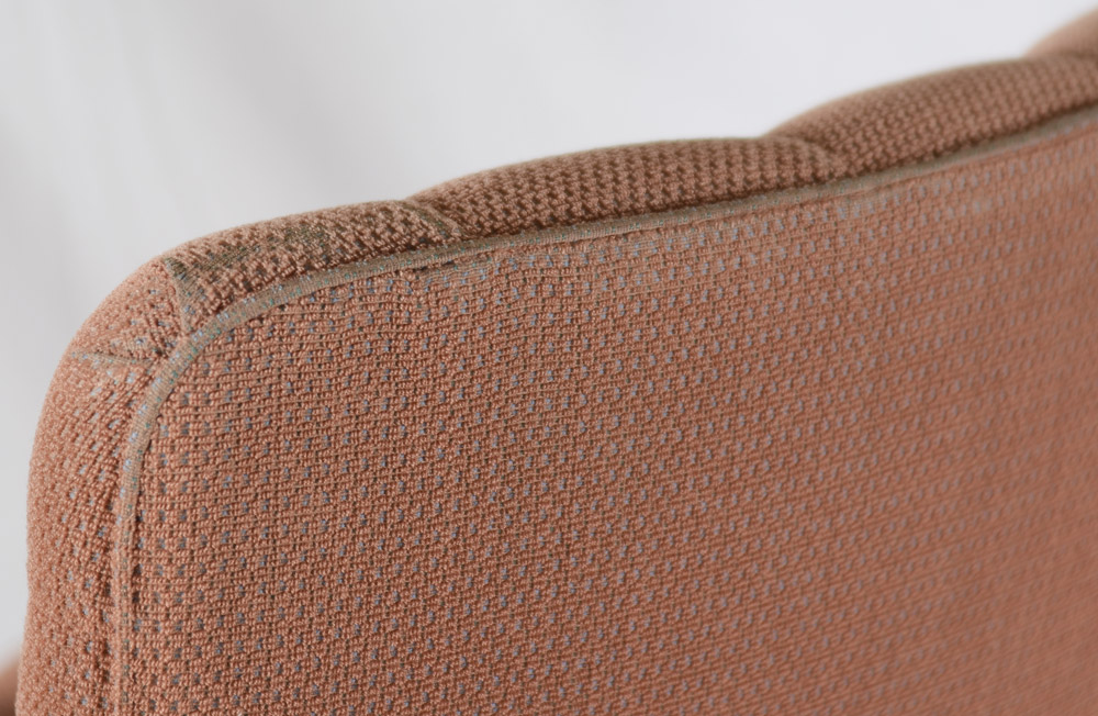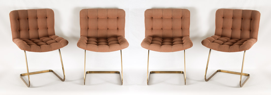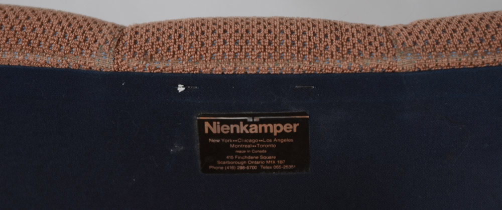 NIENKAMPER SIDE CHAIRS: Set of 4 later mid century side chairs, original tufted upholstery on back and seats, bent metal brass tone legs. Nienkamper Canada label. Measures approx. 31.5'' tall x 21'' x 18''.