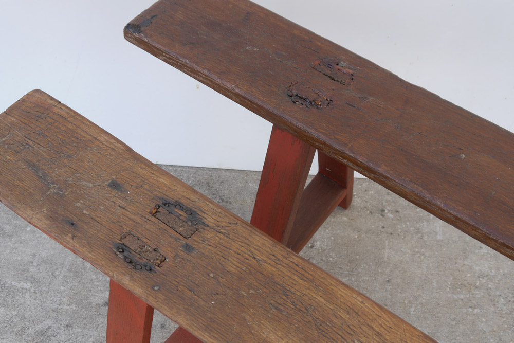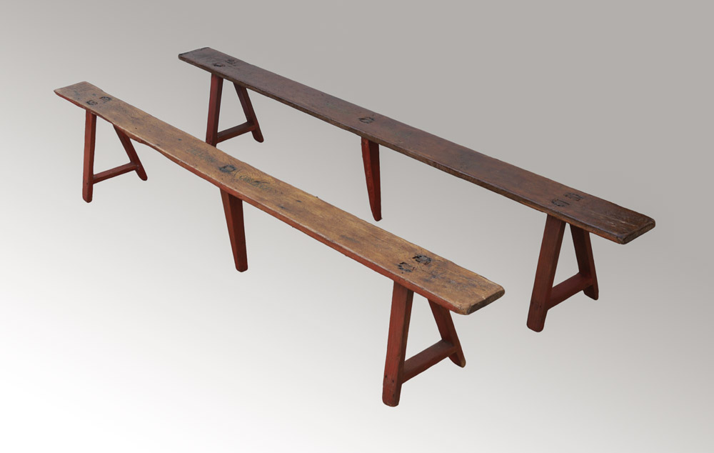 PAIR OF ENGLISH DULWICH COLLEGE BENCHES: Through tenon and nail construction, these benches show years of character from students of this college founded in 1619. Painted with ''Dulwith College'' on top, each overall measures 16 1/4'' h. x 99 1/2'' x 11 1/2''.