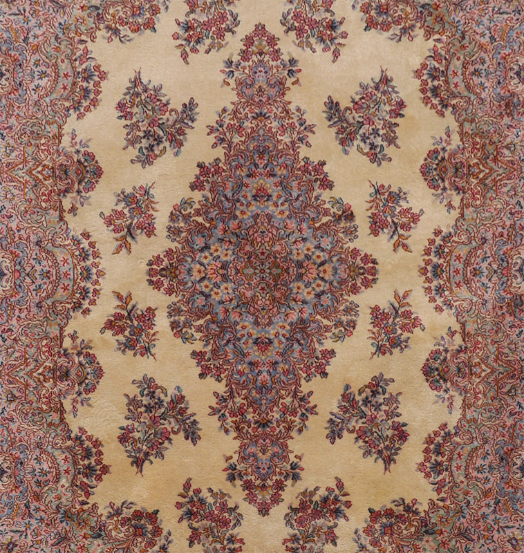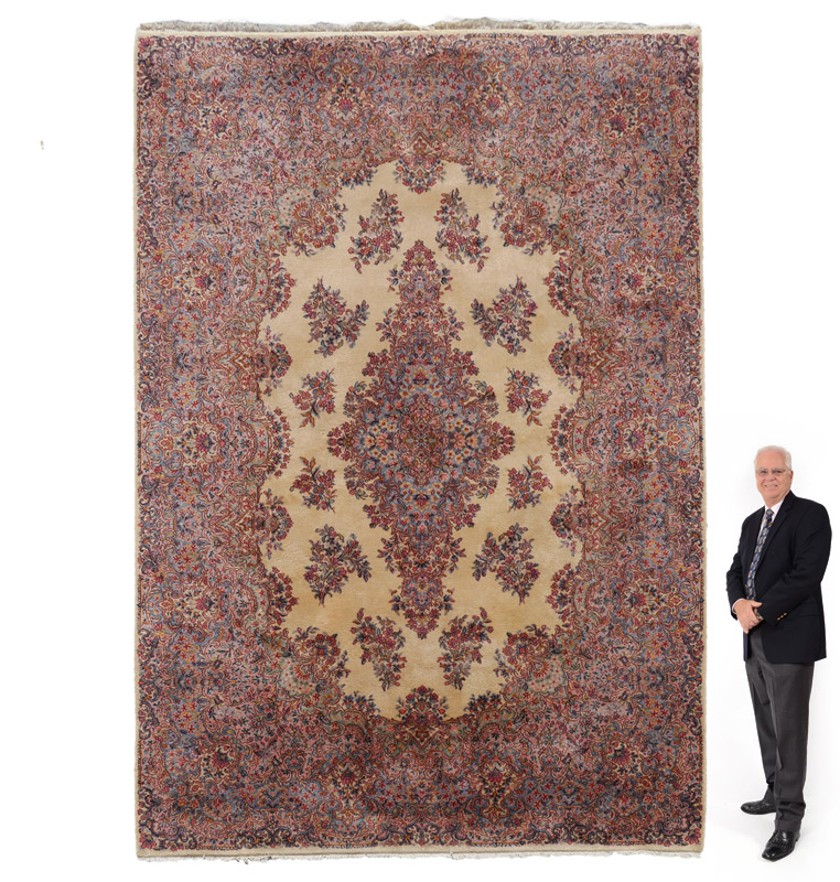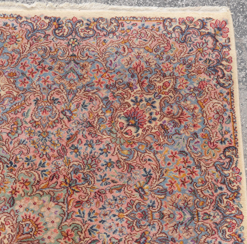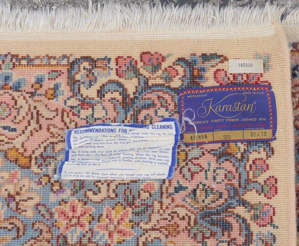 APPROX. 40-60 YR. OLD AMERICAN KARASTAN MACHINE MADE WOOL RUG, 8'7'' x 12'2'': This Karastan has a traditional Persian Kerman design and coloring. The ivory center field has a large diamond shaped medallion that is surrounded by small sprays of flowers done in shades of pale blue, pink, and green. The wide ''broken border'' completes the design and fills in the rug. This rug originally probably cost around $2,000! Condition is good.
