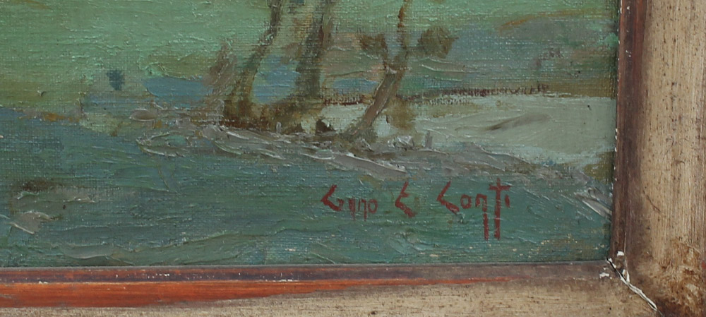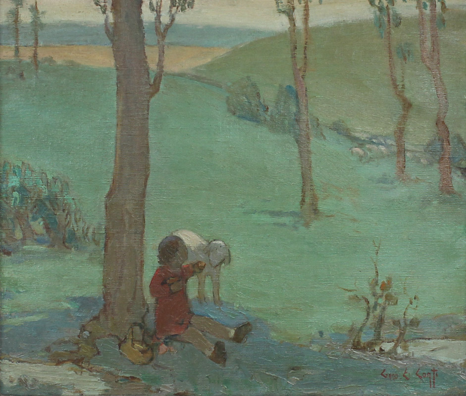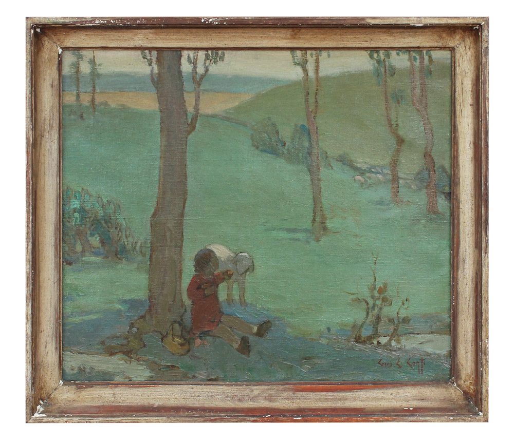 CONTI, Gino Emilio Cesara, (Italian, 1900-1983): Young Child with Lamb in the Foreground and Flock of Sheep in the Distance in a Pastoral Setting, Oil/Canvas, 15'' x 18'', signed lower right, encased in a period antiqued worn frame 17.625'' x 20.75''.