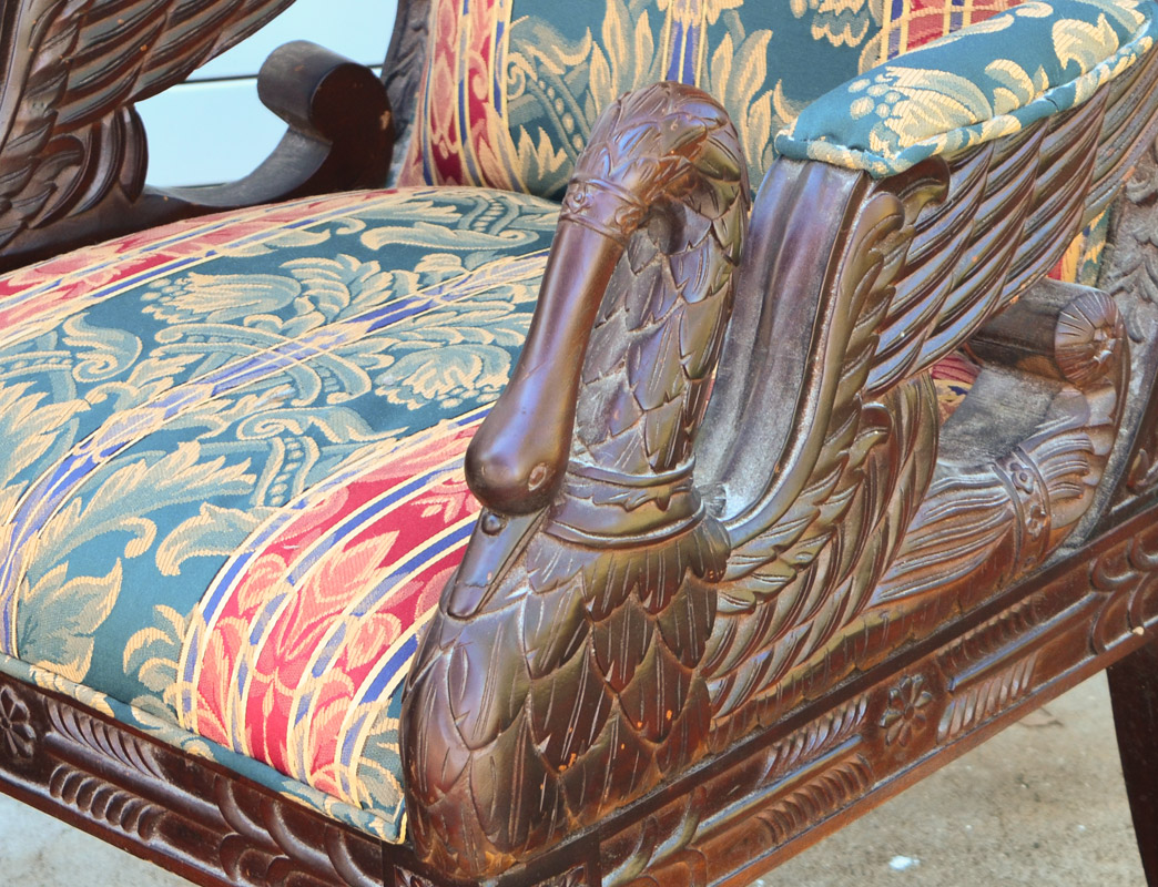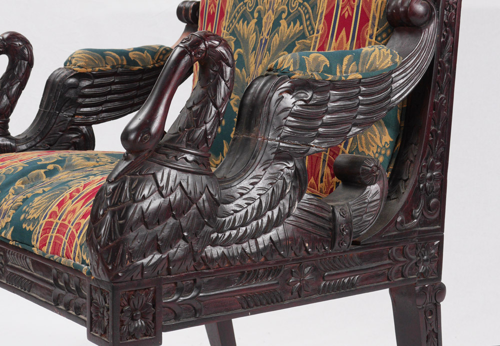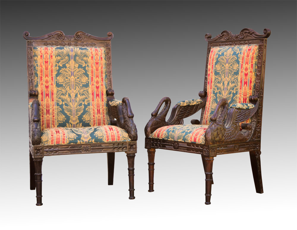 PAIR CARVED FIGURAL SWAN CHAIRS: Profusely carved frames, top rail with scroll and foliate motif, floral sides, figural winged swan armrests, foliate skirt, fluted and turned front legs. Floral patterned upholstery, overall measure 45 1/2'' h. x 26 1/2'' x 25''.