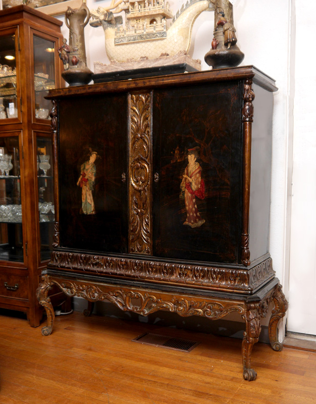CHINESE DECORATED 2 DOOR CABINET / BAR: Paint decorated with oriental motifs and figures, 2 doors with carved center panel, mirrored interior. Carved stiles, skirt and legs, overall measures 60'' h. x 56'' x 20''.