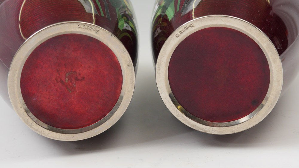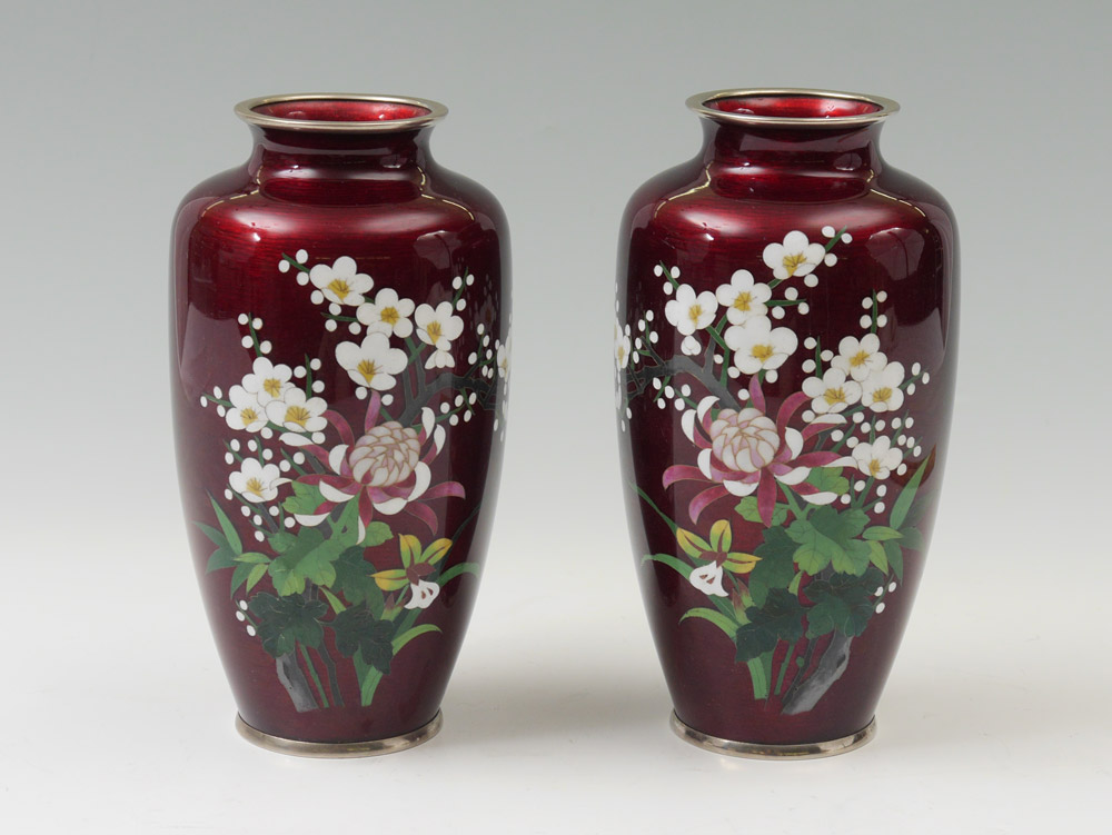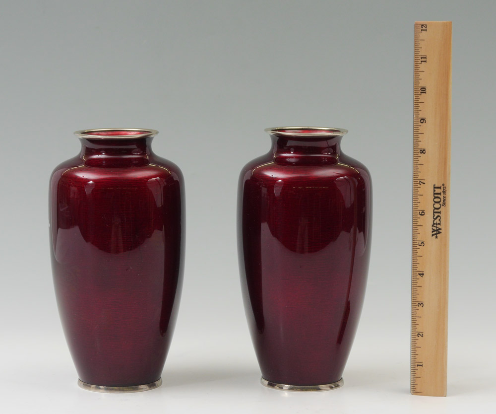 2 JAPANESE GINBARI CLOISONNE VASES: Ox blood ground with floral motif, stamped cloisonne on base rim. 8 1/2'' h. x 4 1/2''.