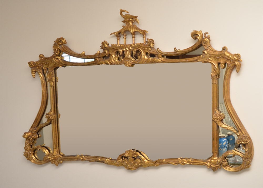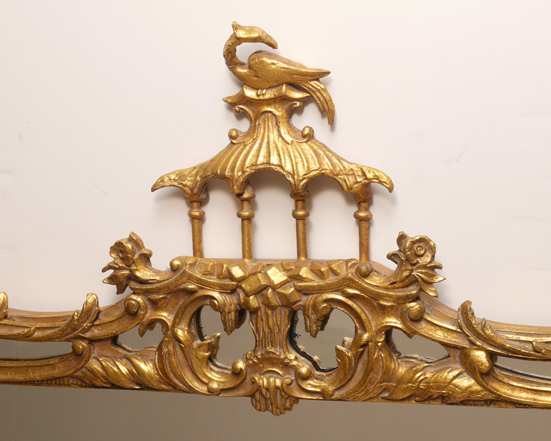 LABARGE CHINESE CHIPPENDALE GOLD GILT MIRROR: Shaped carved gilt wood frame in the Chinese Chippendale style, architectural finial with peacock, overall measures 42 1/2'' h. x 52 1/2'' x 2''.
