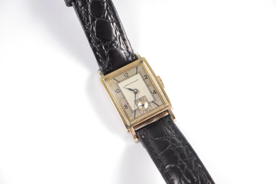 14K GOLD WALTHAM CURVEX TANK WATCH: The case is 14K yellow gold, the dial marked on the even numerals, second sweep window. Mechanical movement in working order. Black leather strap. Length 8.5''. Interior of case not examined.