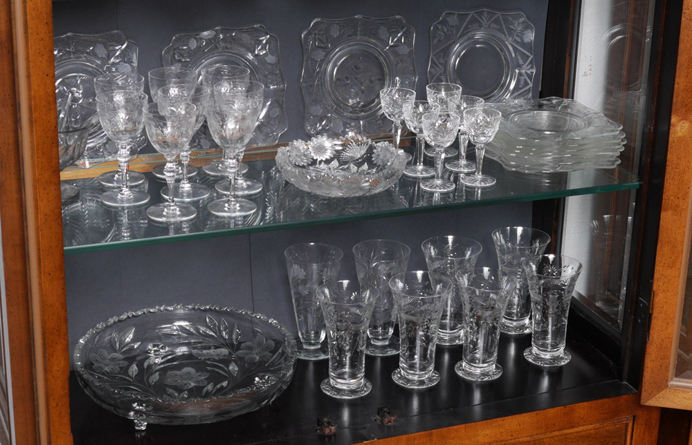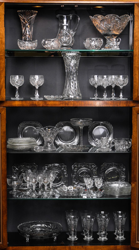 ESTATE COLLECTION OF CUT GLASS: Everything you see in the cabinet, approx. 72 pieces of assorted cut and etched glass. Largest footed center bowl measures 8 3/4'' h. x 11''.