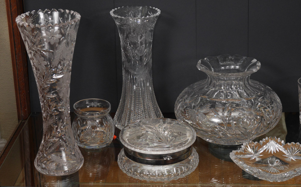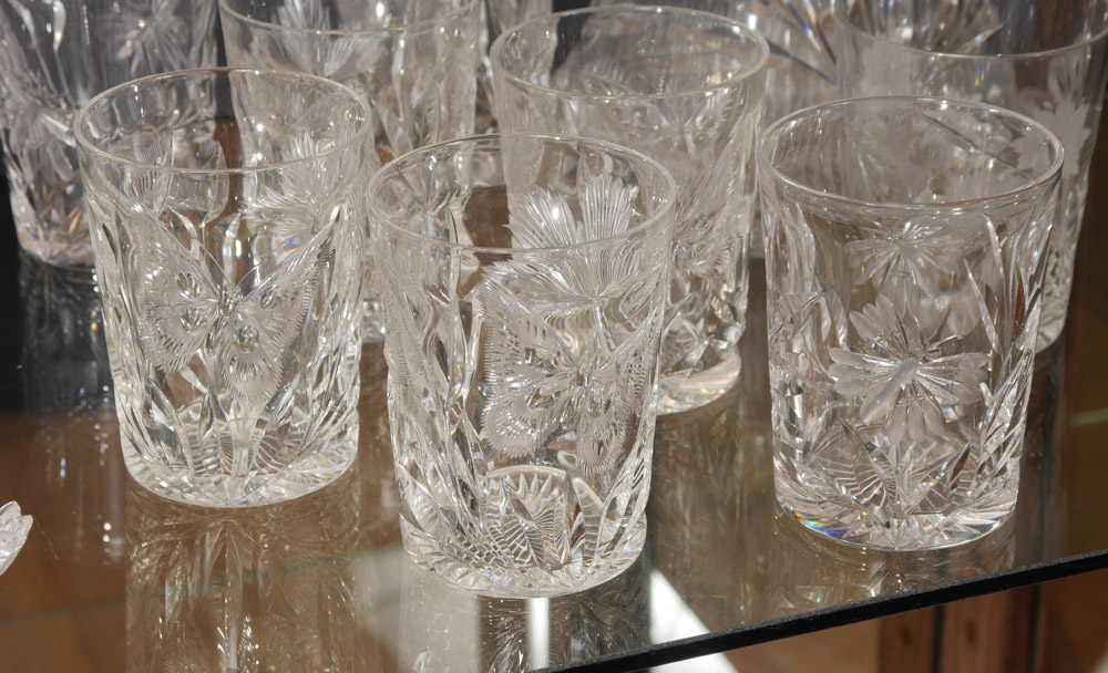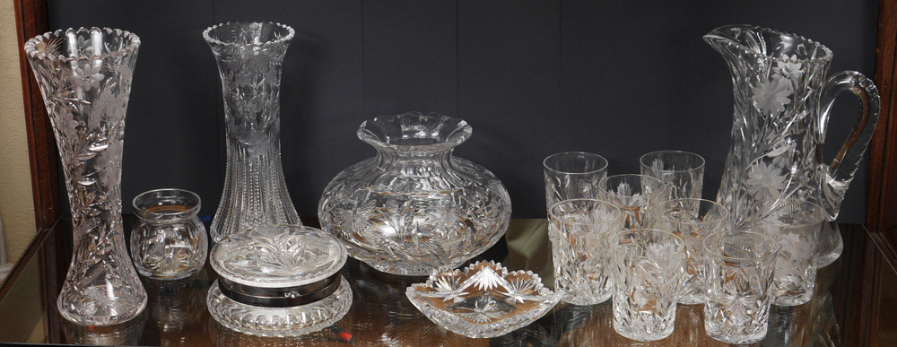 BUTTERFLY MOTIF AMERICAN BRILLIANT CUT GLASS: 15 piece group to include large squat vase, pitcher, tumblers, vases. Sold as a lot.