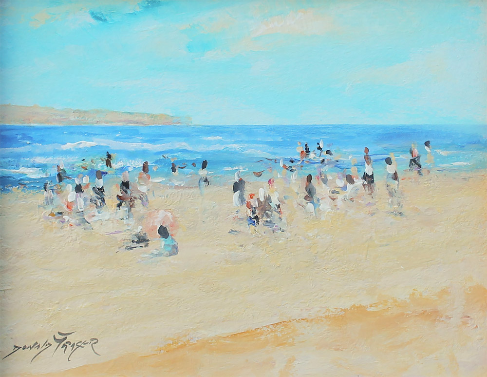 FRASER, Donald, (American, 1929-2009): Busy Beach Scene with Figures, Oil/Board, 8'' x 10'', signed lower left, framed, 13.5'' x 15.75''.