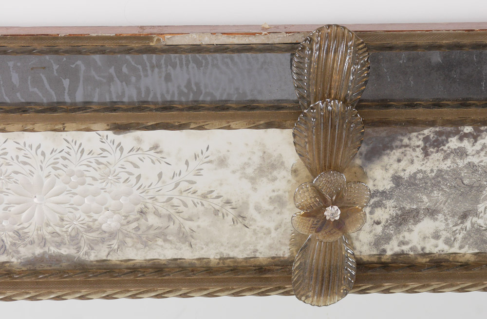 VENETIAN STYLE ETCHED WALL MIRROR: Rectangular wall mirror with etched floral motif panels, applied rosettes and petals, twist glass and metal trim. 40 1/4'' x 31 3/4'' x 2''.