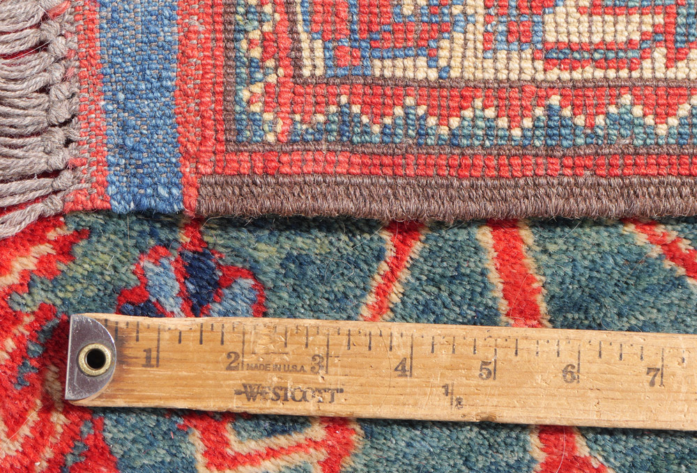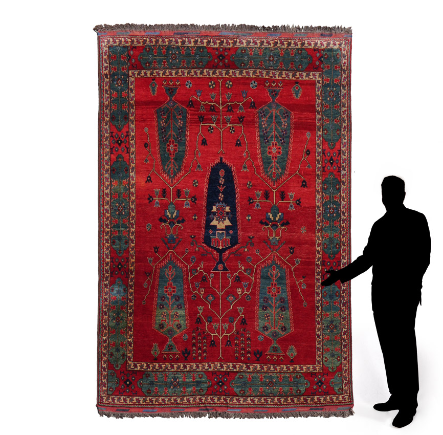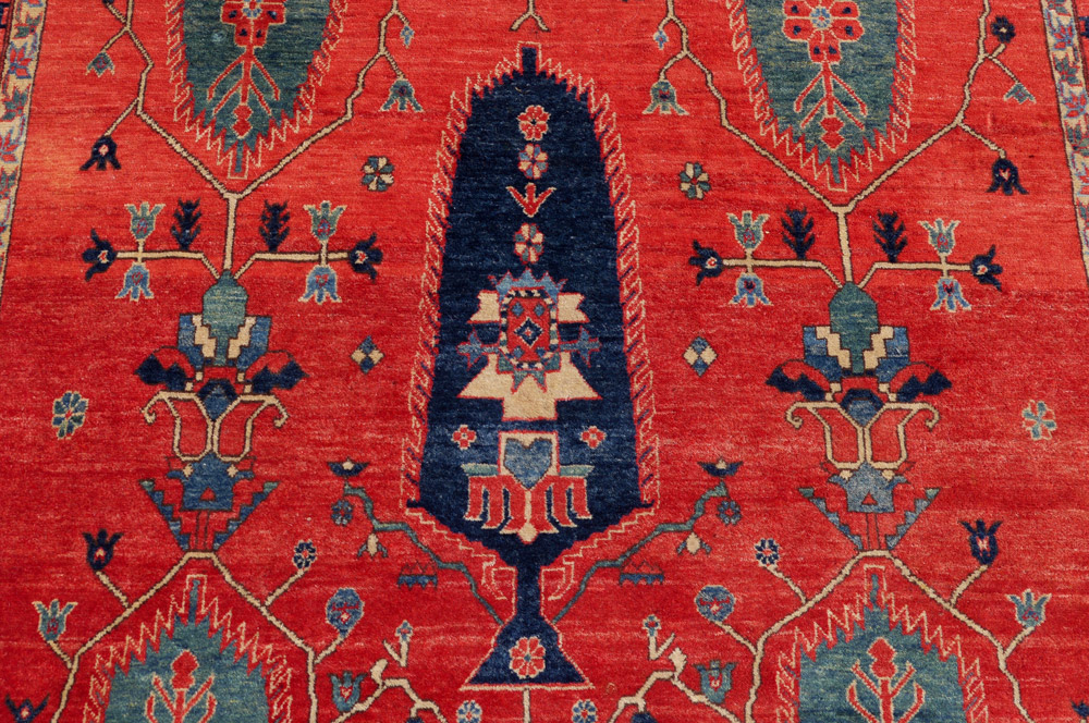 APPROX. 15-25 YR. OLD TURKISH HAND KNOTTED WOOL RUG, 7'3'' x 9'11'': This rug has an interesting design consisting of five large stylized Cypress trees, a blue one in the center and two turquoise blue side by side at each end. In the center of each tree is a simple design and each make a strong contrast to the red-rust field they rest on. The turquoise and red-rust are also found in the border of the rug. Condition is good.