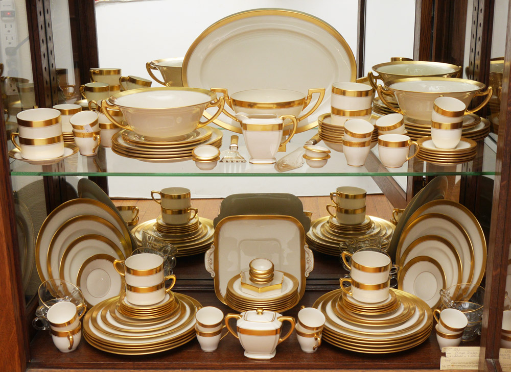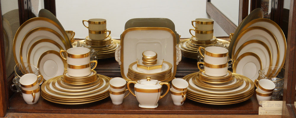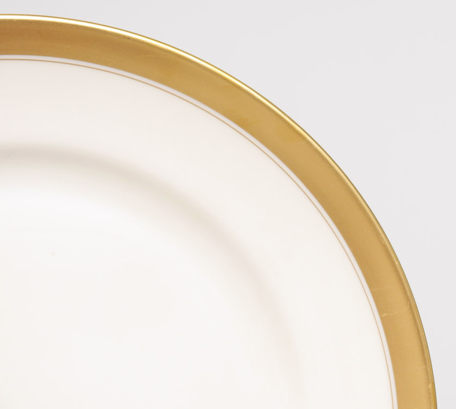 LENOX GOLD RIM FINE CHINA: Approx. 126 pieces to include 11 dinner plates (10.5'), 12 luncheon, 12 salad plates, 9 bread plates, 8 dessert bowls, 2 open vegetable with handles, 1 cream, 1 sugar, 8 salts, square cake plate, small compote, square base handled compote, 6 cups with saucers, 20 demi-tasse cups with saucers, and 8 glass gold rim bouillon cups.